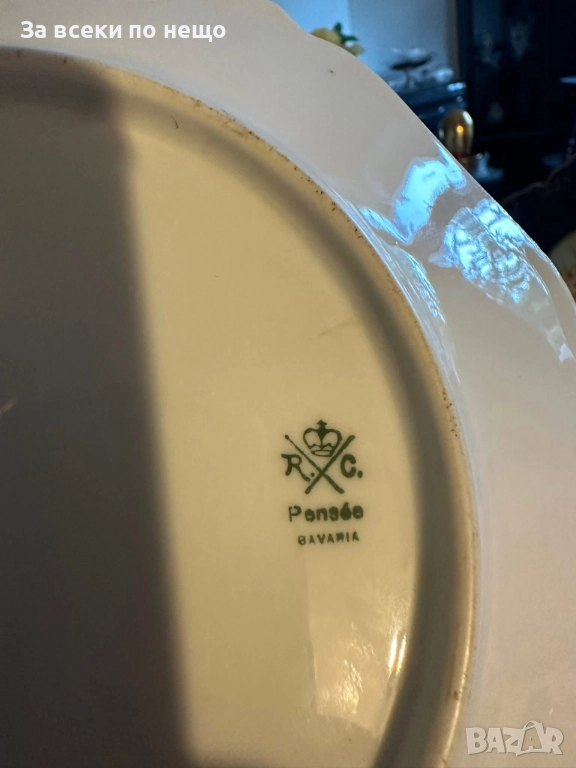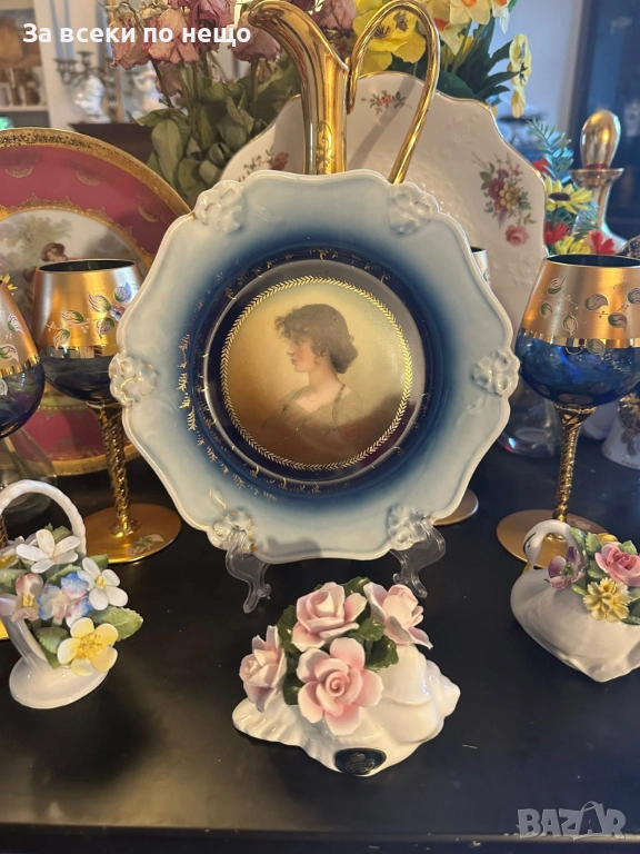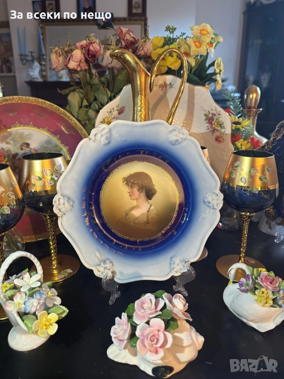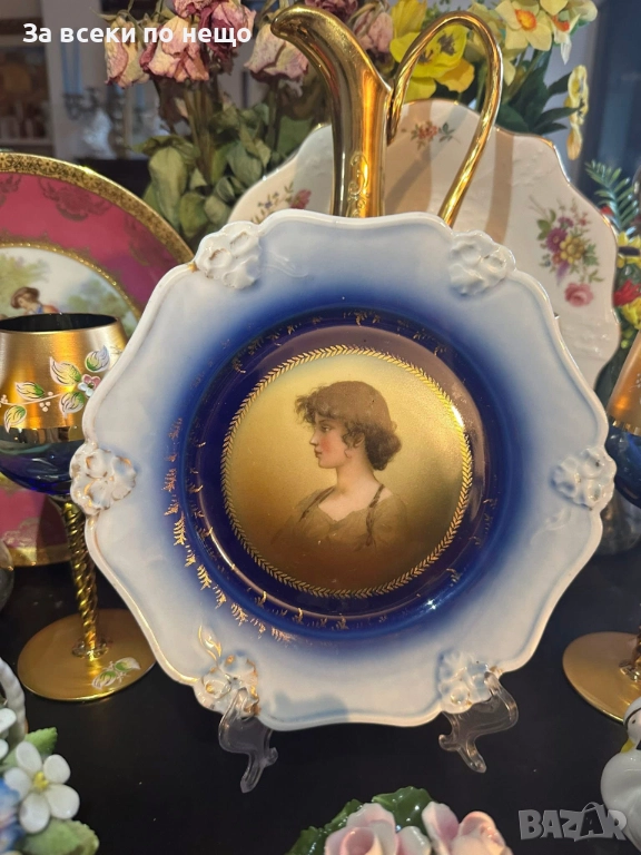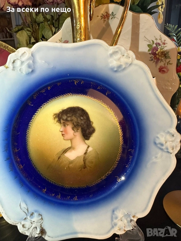 - великолепно портретно плато на изключително красива баварка, ръчно нарисувана подглазурна картина с изключителна прецизност и висока художествена стойност, млечно син фон преливаш в кобалтово , леки релефни и златни елементи, диаметър 21 см, богатство за всяка колекция или витрина много добро винтидж състояние.