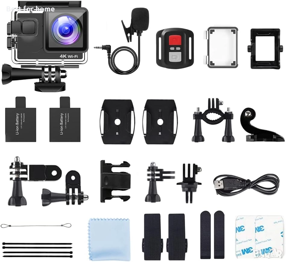 Богати аксесоари: спортната камера съдържа повечето видове аксесоари, от които се нуждаете, като например 2 x 1050 mAh батерии, държач за каска, стойка за велосипед, дистанционно управление, прахоустойчив капак, въртящ се на 360 градуса винт, микрофон и други аксесоари. Започнете с пакета „всичко в едно“.