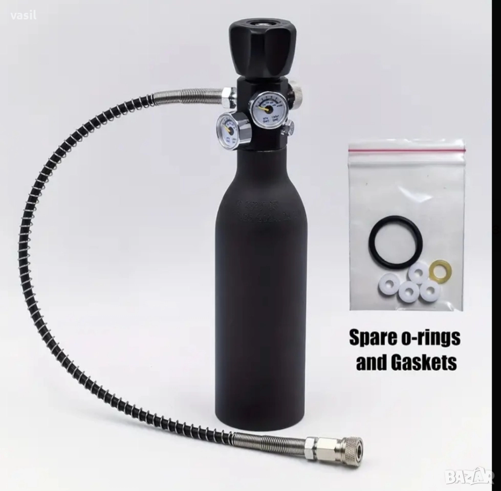 Продавам висококачествен вентил (редукторен кран) за PCP бутилки, изработен от здрава алуминиева сплав, с двойни манометри и високонапорен маркуч 50 см.