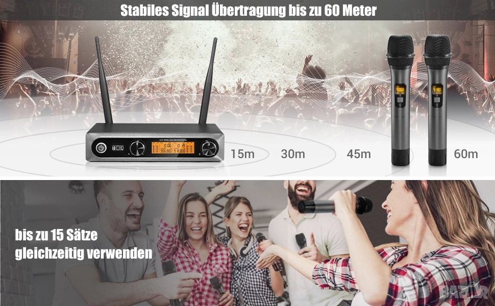 * Широк обхват на предаване: Тези безжични микрофони имат обхват на предаване до 60 метра със звук без изкривявания. Те осигуряват стабилен сигнал, без закъснение, без излъчване, както и функции против хаулинг и смущения.