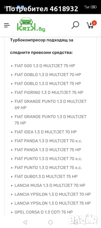 Продавам турбокомпресор от Фиат Гранде Пунто 1.3 Multijet 75 к.с.