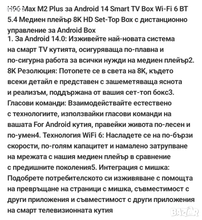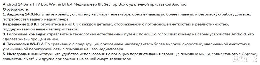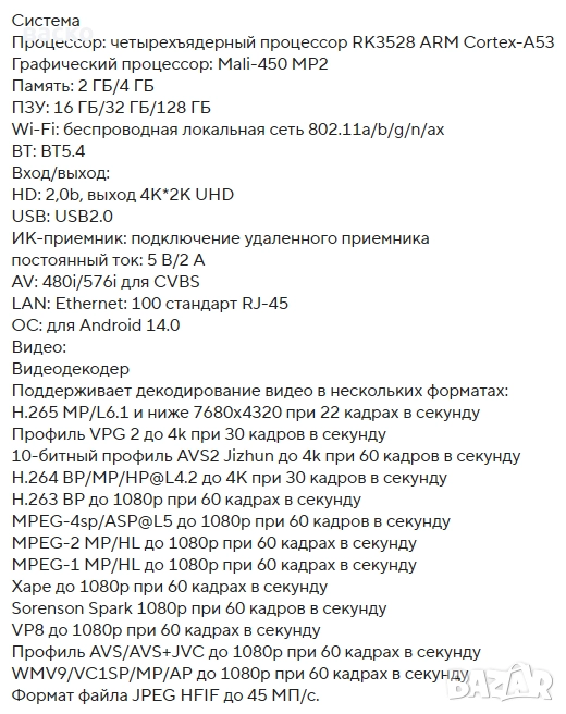 Мощния чип RK3528, той осигурява изключителна производителност и плавна работа. Работещ на Android 14, той предлага безпроблемно и интуитивно потребителско изживяване с подобрена сигурност и достъп до широк спектър от приложения. Насладете се на зашеметяваща визуална яснота с пълна 8K резолюция, която оживява всеки детайл с впечатляваща прецизност. Възползвайте се от по-бързи и по-надеждни интернет връзки с WiFi 6, което гарантира плавен стрийминг и подобрена обща мрежова производителност. Повишете гледането си с напредналата технология.