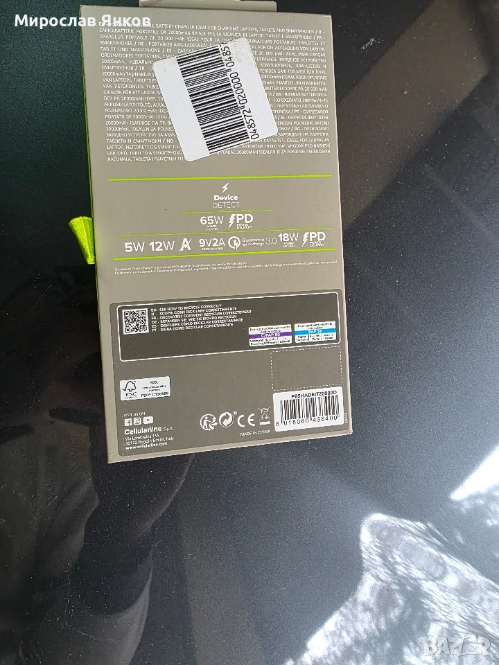 Външна зарядна батерия за преносима употреба. Подходяща за зареждане на различни устройства като смартфони и таблети. Идеална за пътувания и в случай на необходимост за допълнително захранване. Бързо 65 W зареждане. 20 000 ma/h.