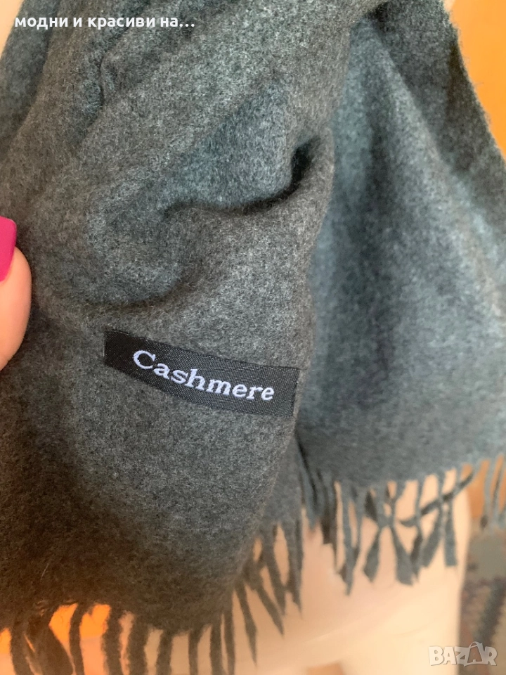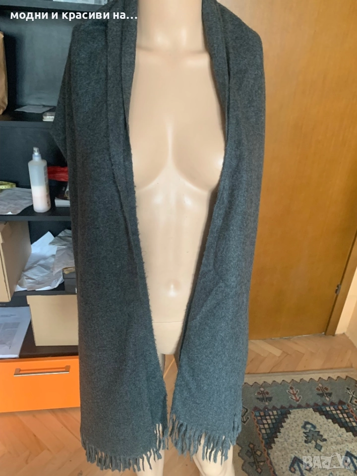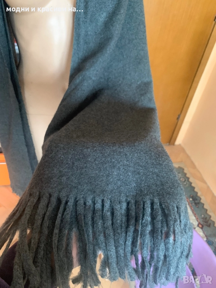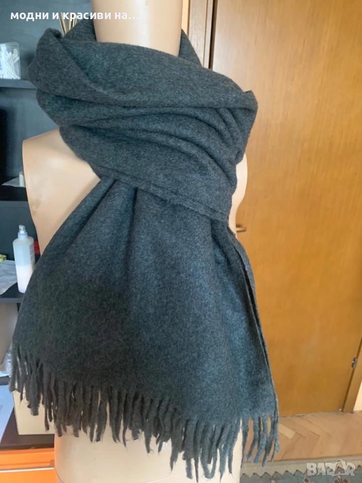 кашмира. Невероятно удоволствие е допира му до кожата. Като уютна, пухкава прегръдка е. Цветът е тъмносив, завършва с ресни.