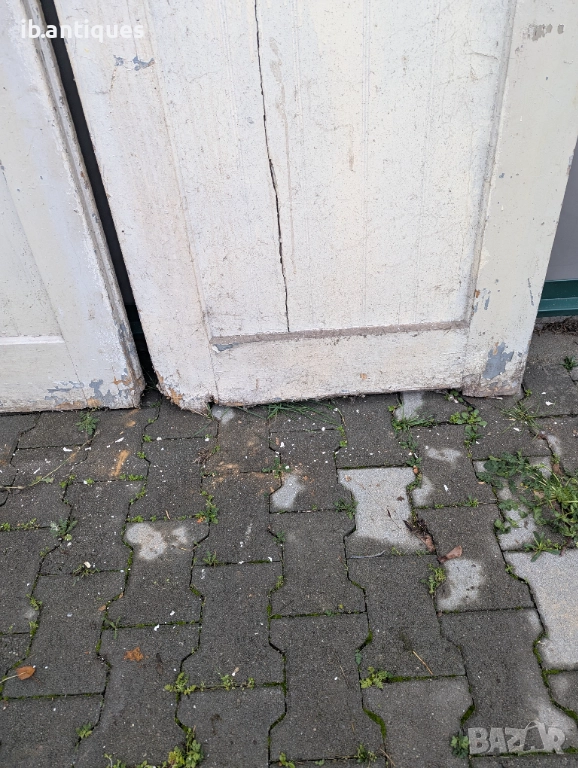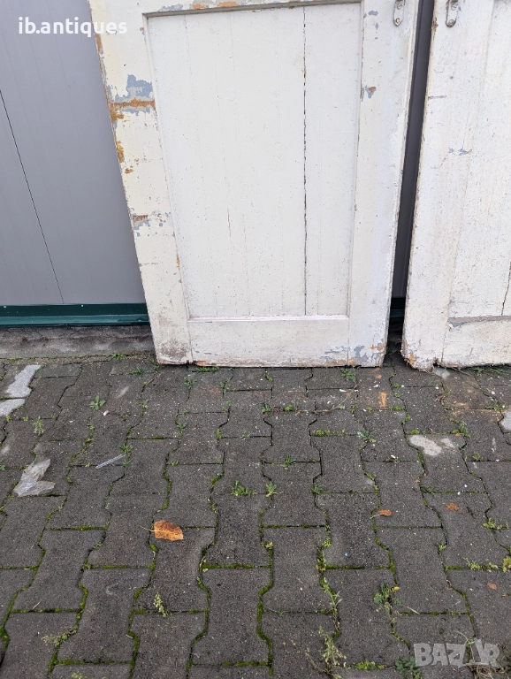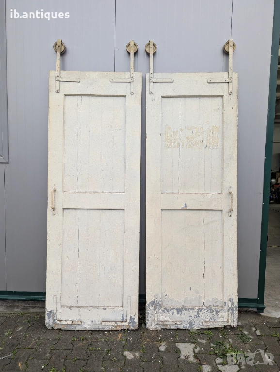 Стари дървени врати от 20-40г. на миналият век с оригинални колелца за плъзкащият механизъм. Силно олющената им боя и износването в долната им част подсказва за тяхната възраст.