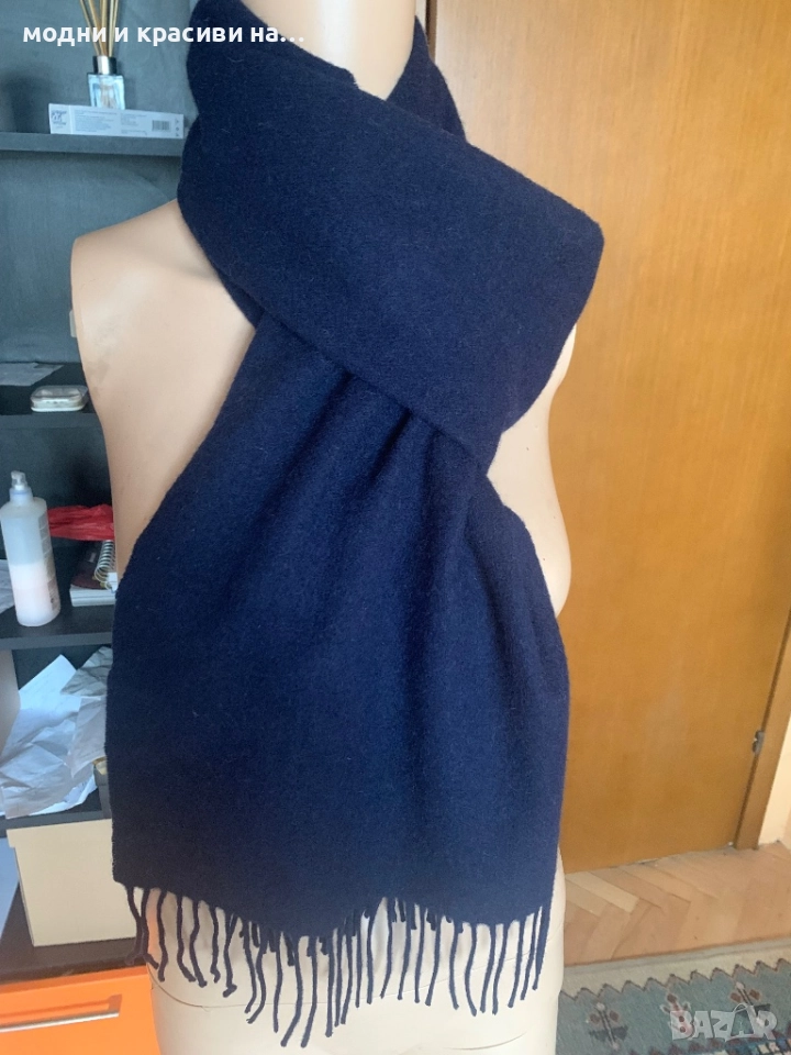 Стилен, изискан тъмносин вълнен шал, завършващ с ресни.