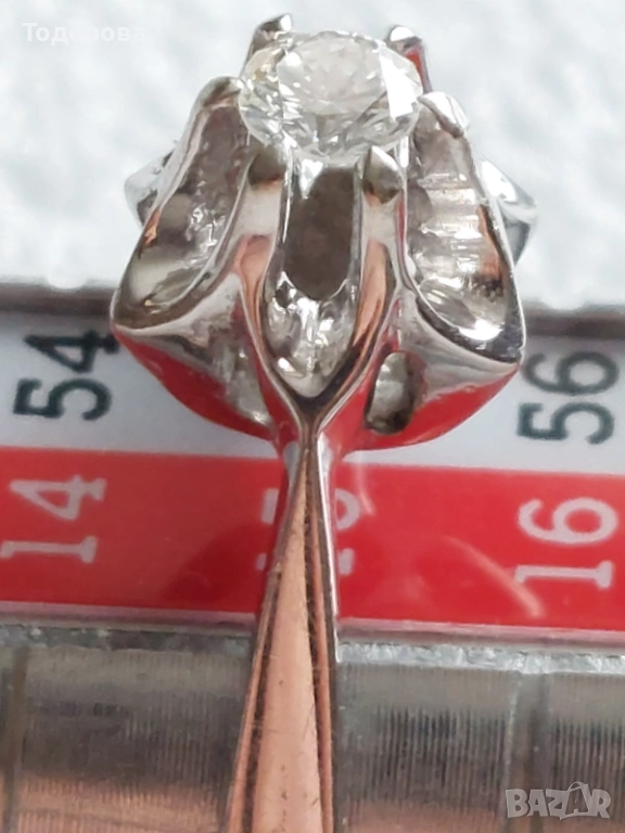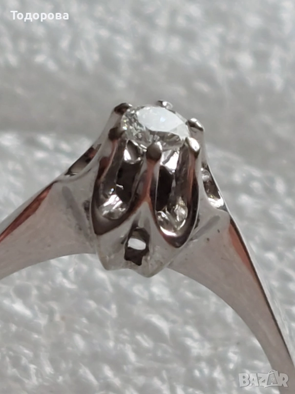 Дамски златен пръстен с инкрустиран диамант 0.20 карата,бяло злато проба 750 → Обява 52592247