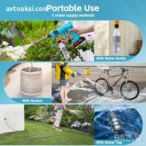 Преносима акумулаторна водоструйка с приятен дизайн и регулируеми настройки на дюзите. Има здрава метална тръба с месингова бърза връзка за дюзите. Може да използва вода от водопроводната мрежа, както и от други съдове, като бидон, туба, река и др. Оборудвана е с 2 дюзи (червената) за концентрирана струя и (бялата) за разпръскване на водната струя във ветрилообразна форма под ъгъл от 40°. Цедка против замърсяване при теглене на вода извън водопроводната мрежа. Подходяща за практическа ежедневна употреба.