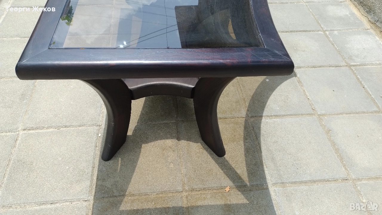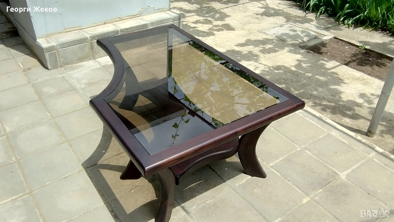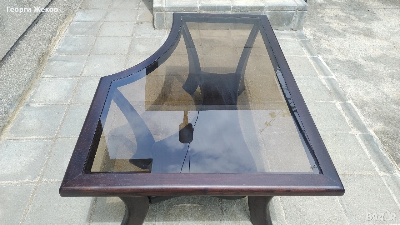 Холна маса с размери : 550/1300/900 със затъмнено , закалено стъкло 12мм. Рамката е изработена от буков материал по метода "варен бук" . Масата не е използвана и няма забележки по дървесината и стъклото , всичко по снимките е истинско и не е претърпяло допълнителна обработка.
