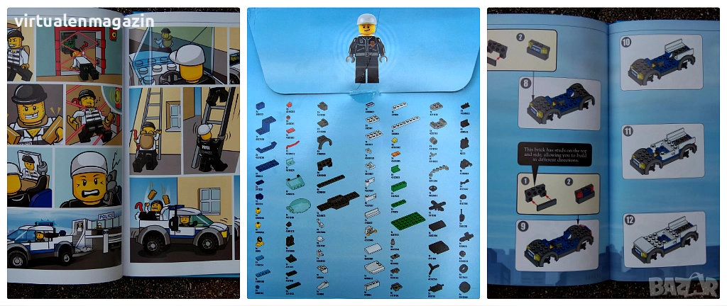 Съдържа над 130 Lego тухлички, 2 минифигурки, книга с инструкции, история и комикси.