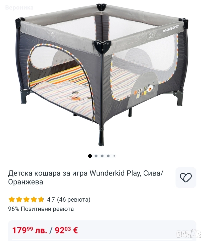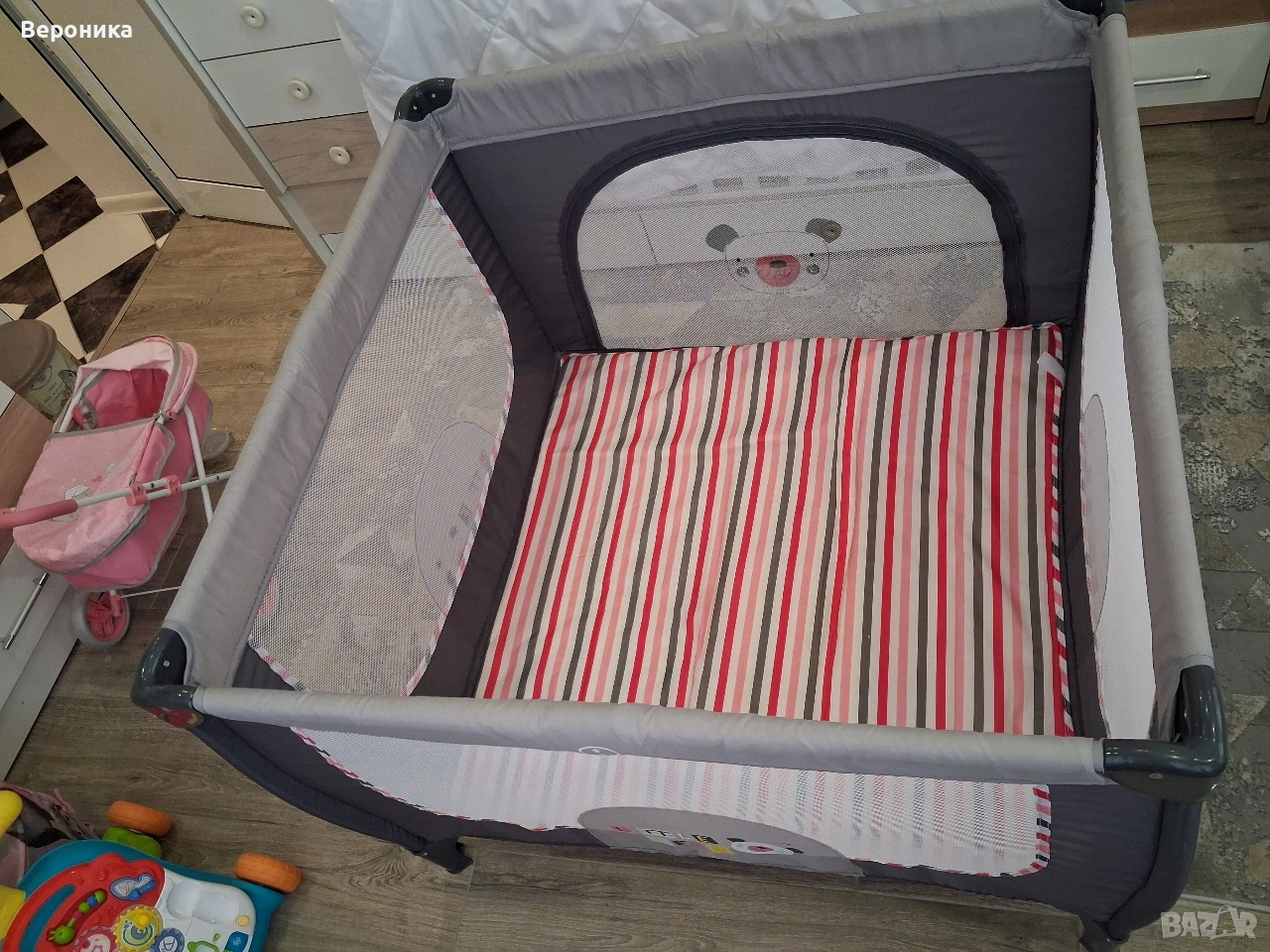 Детска кошара за игра Wunderkid Play, Сива Ползвана е като склад за играчки - като нова е👌 💰Цена 90,00 лв., вместо 179,00 лв. Кошарата за игра Wunderkid предлага на малките безопасно място за игра. Тя е цветна и разполага с различни рисунки, които улавят вниманието на децата, Снабдена е с удобен отвор с цип за по-лесен достъп до детето. Неоспоримото предимство на тази кошара е, че страните са изработени от прозрачна мрежа за по-добра видимост. Кошарата се препоръчва за едно дете с тегло до 14 кг и до 90 см височина. Тя е сертифицирана в съответствие с европейските стандарти. - Разполага с устойчив под и матраче; - Пластмасови предпазни ъгли за предотвратяване на злополуки; - Изработена от качествени материали, устойчиви във времето шевове; - Прозрачна мрежа, позволяваща наблюдението на детето от всякакъв ъгъл; - Странична врата с цип; - Лесна за монтаж и демонтаж, идеална както за пътуване, така и за дома; - Почиствате лесно с мокра кърпа и вода между 10 и 40 °C; - Включена е транспортна чанта с 2 дръжки. - Размери: 100 х 100 х 76 см Препоръки: - Да се употребява само от едно дете с максимално тегло 14 кг и максимална височина 90 см;