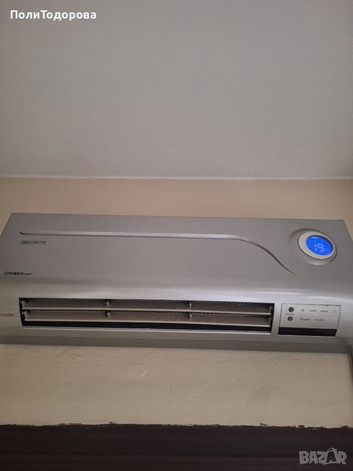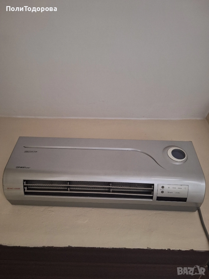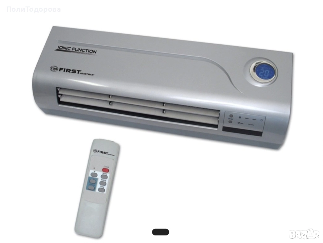 Керамична печка за стена First Austria FA-5571-6 Характеристики: Мощност: 2000 W 230V 50Hz Студен / топъл / горещ въздух1000W/2000W мощност Настройки на захранването Дистанционно управление Таймер Йонна функция LCD дисплей Индикатор за температурата Цвят: сив