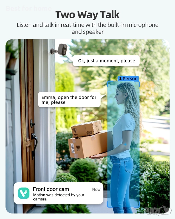 Двупосочен разговор и сирена в реално време - Домашната охранителна камера има вграден микрофон и високоговорител, което позволява плавни и ясни двупосочни разговори с посетителите на вратата. Когато бъде засечено движение, wifi камерата ще задейства аларма, бялата светлина ще мига (тази функция е деактивирана по подразбиране и може да се настрои в приложението) и ще записва видеоклипове в реално време, изпращайки това съобщение до вашия телефон чрез приложението, като ефективно прогонва някои неканени гости.
