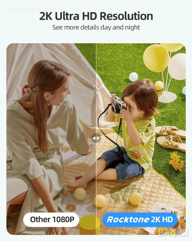2K QHD резолюция и пълноцветно нощно виждане - За разлика от типичните 1080p камери, безжичната външна камера Rocktone предлага 2K UHD резолюция, осигуряваща двойна яснота. Тя разполага с широкоъгълно зрително поле и може да се похвали с два режима на нощно виждане: пълноцветен и инфрачервен, което позволява максимален обхват на наблюдение от 10 метра. Това гарантира, че ще заснемате висококачествени видеоклипове и изображения дори при условия на слаба светлина.