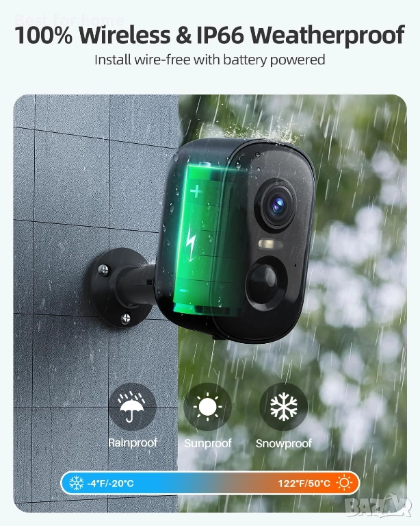 100% безжична, презареждаема, устойчива на атмосферни влияния - Тази външна охранителна камера се отличава с акумулаторна батерия с висок капацитет и работи безжично за безпроблемен монтаж. Предлага се с монтажна скоба и винтове, което елиминира нуждата от сложно окабеляване и допълнителни контакти. Едно зареждане осигурява от 1 до 5 месеца работа. С водоустойчивост IP66, тази камера е изключително устойчива на атмосферни влияния и работи надеждно при различни неблагоприятни условия.