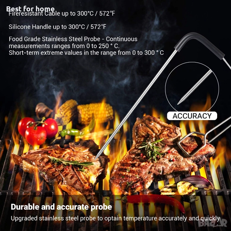 【ТЕРМОМЕТЪР ЗА БАРБЕКЮ С ШИРОК ТЕМПЕРАТУРЕН ДИАПАЗОН】: Този безжичен цифров термометър показва температурата в реално време, което ви позволява да я следите отблизо. Температурният диапазон за непрекъснати измервания е от 0 до 250°C. Поддържат се краткосрочни екстремни стойности в диапазона от 0 до 300°C. Точността на термометъра е ±1°C. Отсега нататък винаги можете да приготвяте храната си удобно с точни температури.