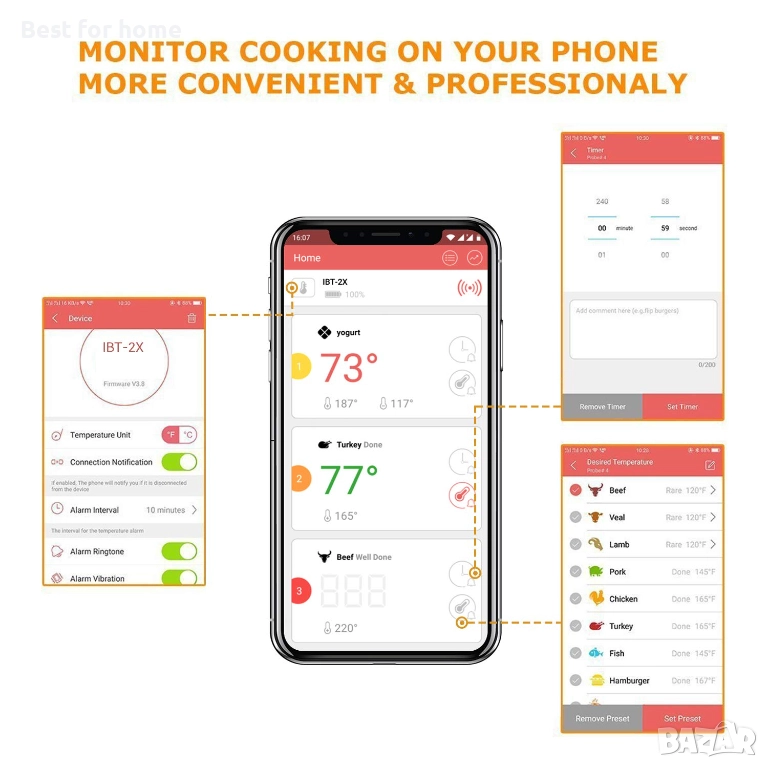 【ЛЕСЕН ЗА ЧЕТЕНЕ LED ДИСПЛЕЙ】: Нашият Bluetooth термометър улеснява отчитането с лесни за четене LCD дисплеи. Включената сонда от неръждаема стомана позволява точно измерване на температурата, а двойната връзка позволява едновременно измерване на две ястия. Алармата за температура, температурният диапазон и алармата за обратно броене ще направят печенето на скара много по-лесно, дори за начинаещи.