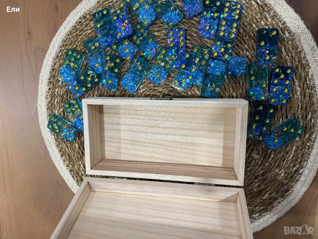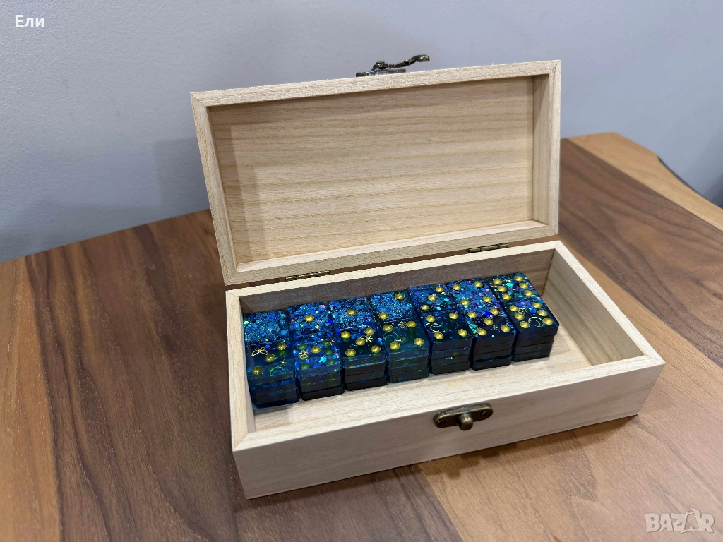 Ръчно изработено, луксозно домино с прилежаща дървена кутийка за съхранение.