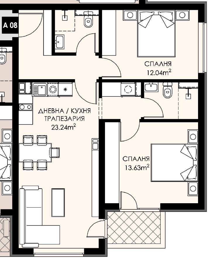 АПАРТАМЕНТ А08 - ЗП - 81,22 кв.м.; ОЗП - 94,67 кв.м.; Изложение: ЮГ