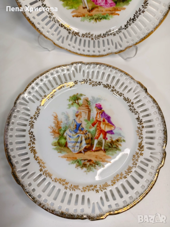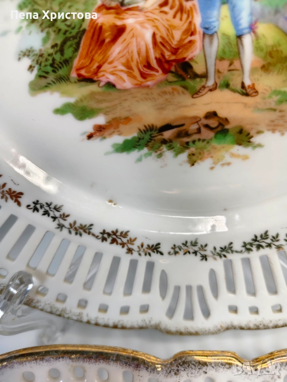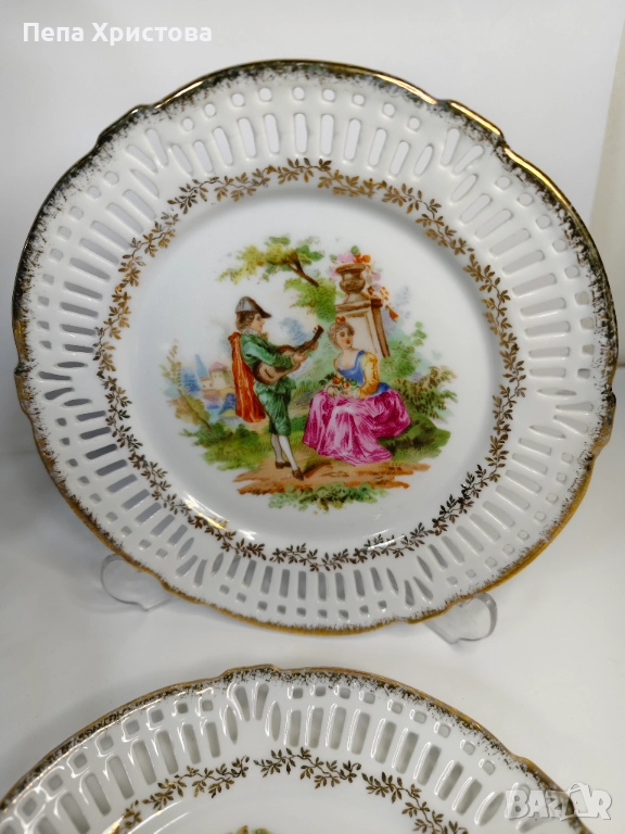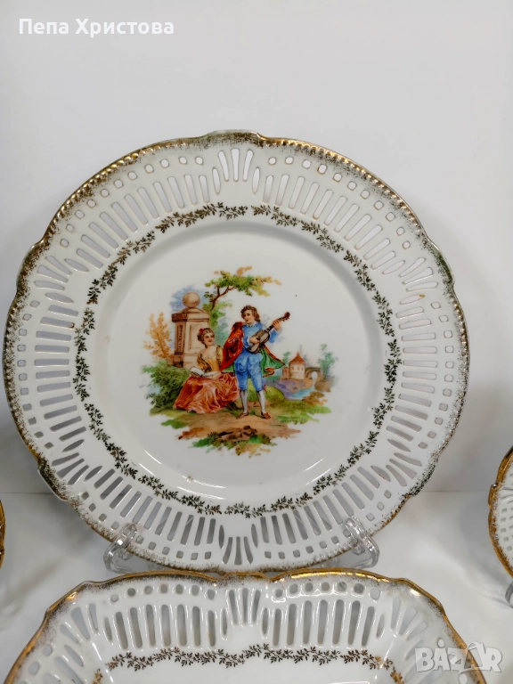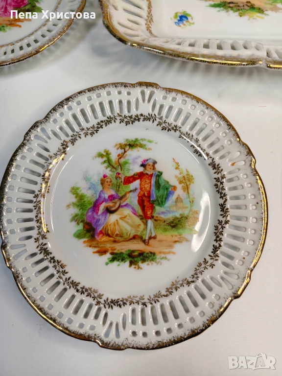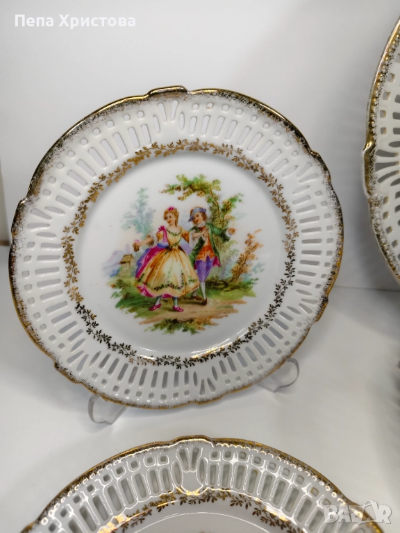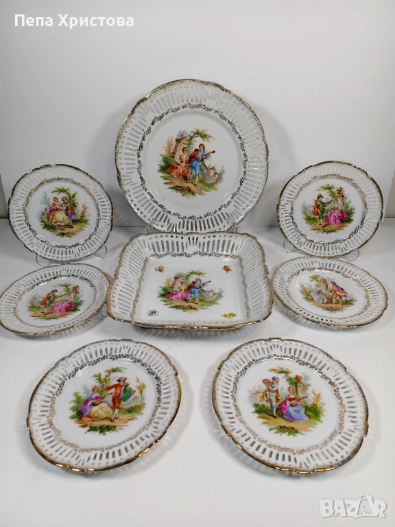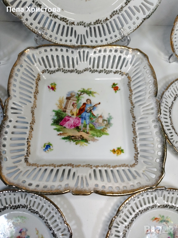 Сервиз за торта от немски ажурен порцелан Schwarzenhammer с декор рококо "влюбена двойка" или по-известни като "Ромео и Жулиета" и нежен златен кант. Изработка между 1940-1950г.