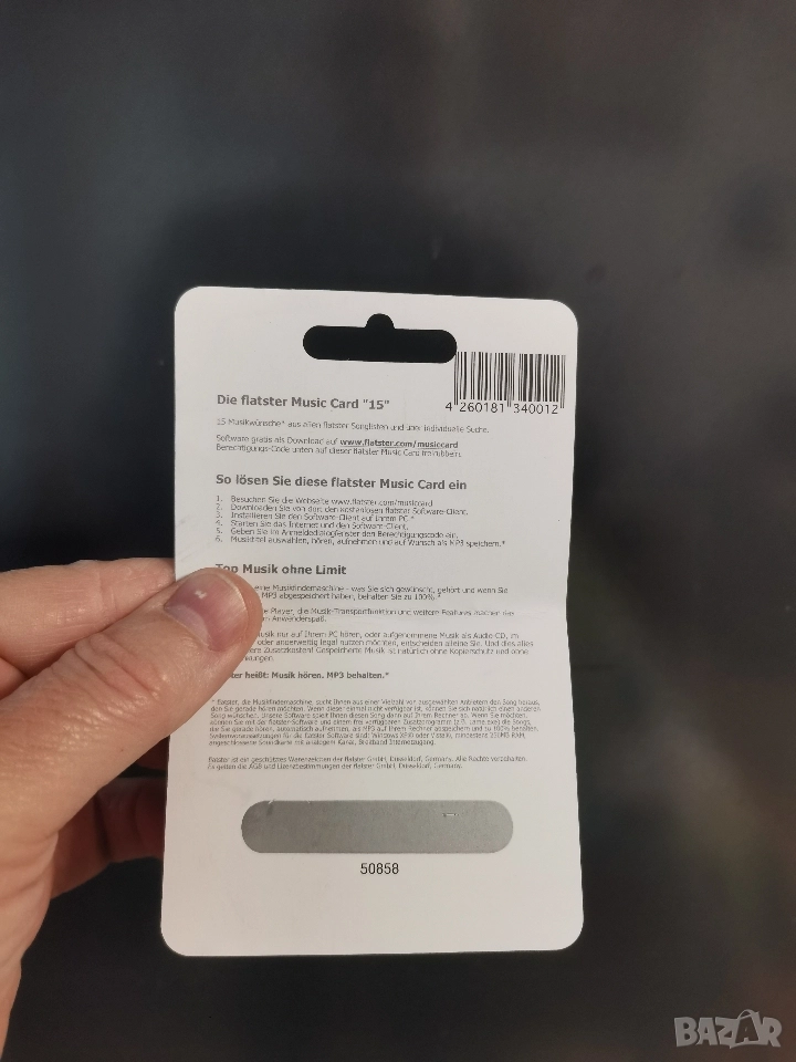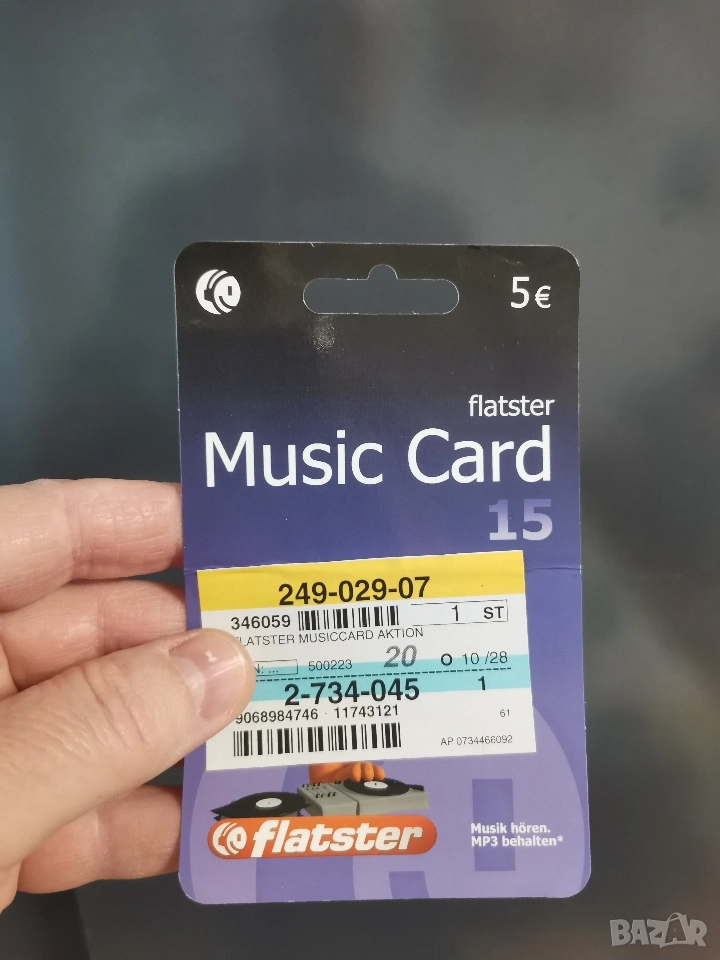 Пълен комплект кутия, кабел за трансфер, диск със софтуер, инструкция за ползване, карта подарък за изтегляне на музика от Интернет.