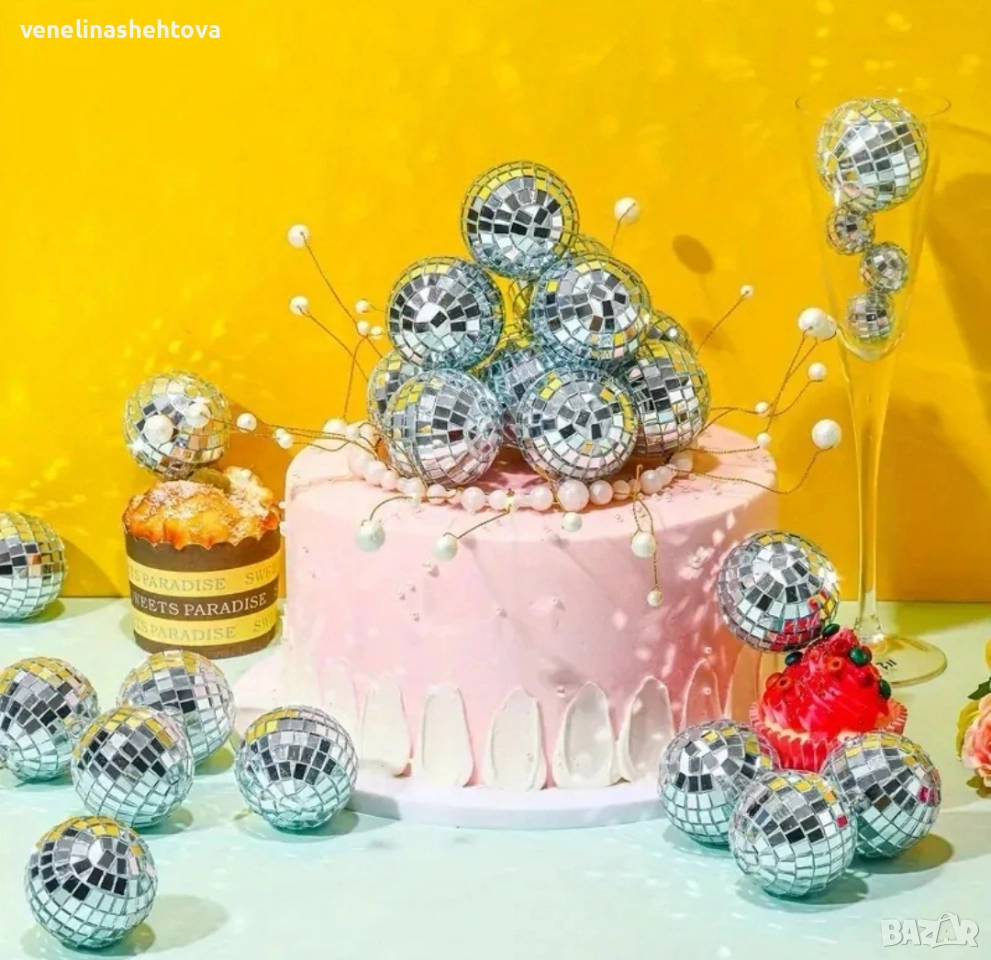 15 броя огледални диско топчета топки за декорация на торта → Обява 52596049