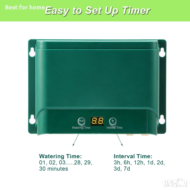 【Програмируем таймер】--- Уредът е лесен за програмиране. Просто задайте времето за поливане (натиснете „set“) и интервала от време (натиснете „set“) и сте готови. Таймерът може да се настройва на интервали от час или ден. Автоматизираният график за поливане предлага 30 режима на работа, с 1, 2, 3…29 30-минутни поливания, на всеки 3, 6, 12 часа или 1, 2, 3 7 дни.