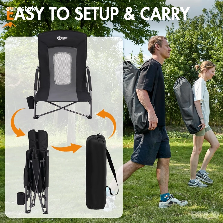 Лесният за сглобяване сгъваем стол ви осигурява място за почивка навсякъде и по всяко време. Освен това, нашите леки столове се предлагат с чанта за съхранение, което ги прави преносими и лесни за носене.