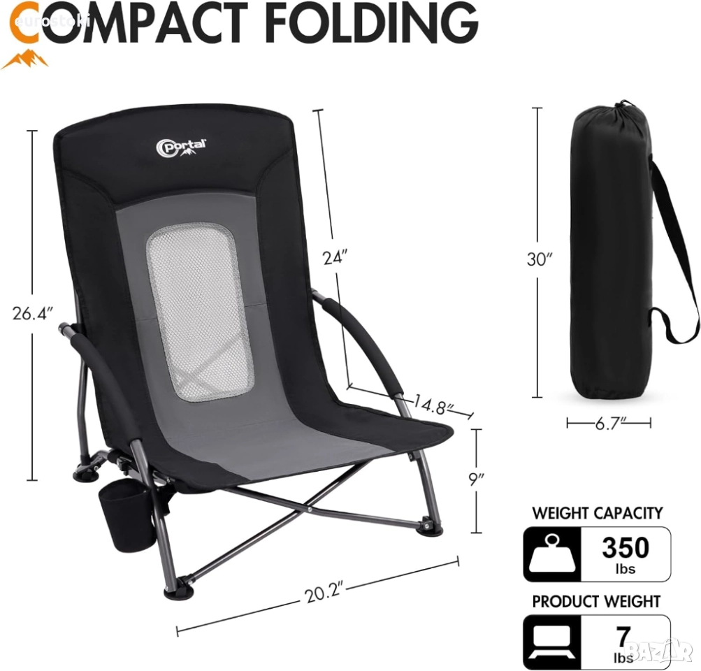 Сгъваем низък плажен стол Portal, лек, дишащ плат, товароносимост 150 кг, с чанта за носене, за плаж