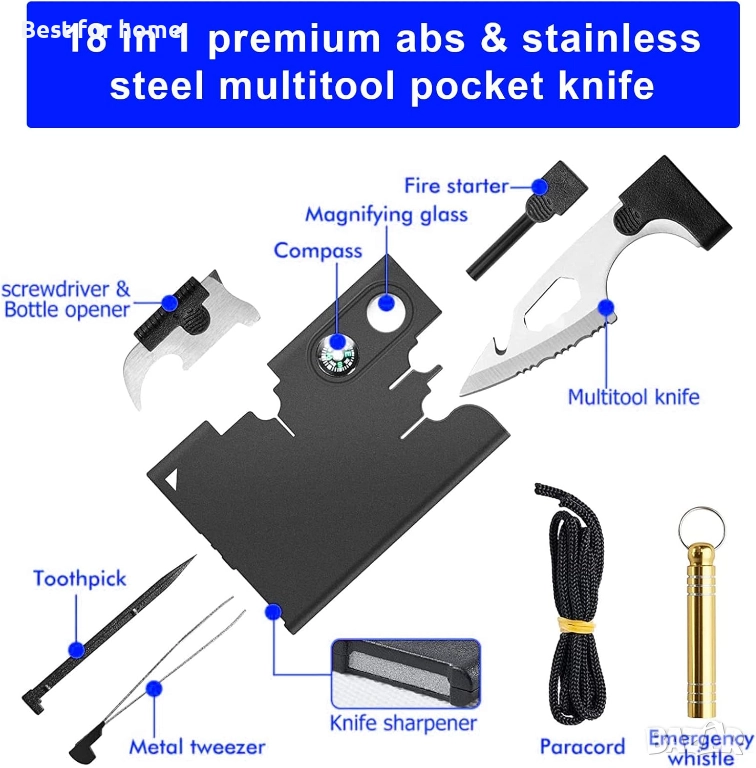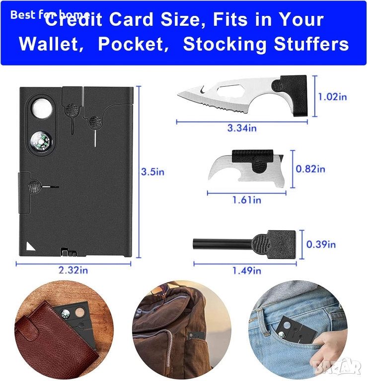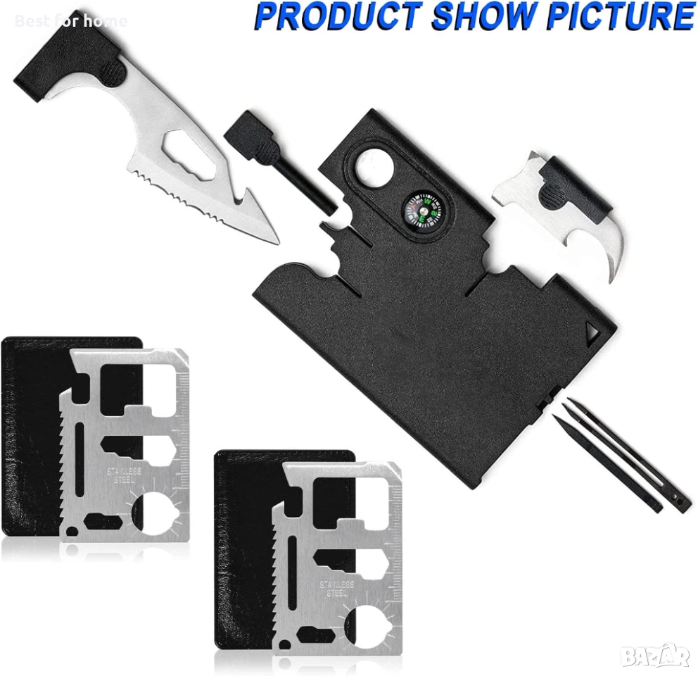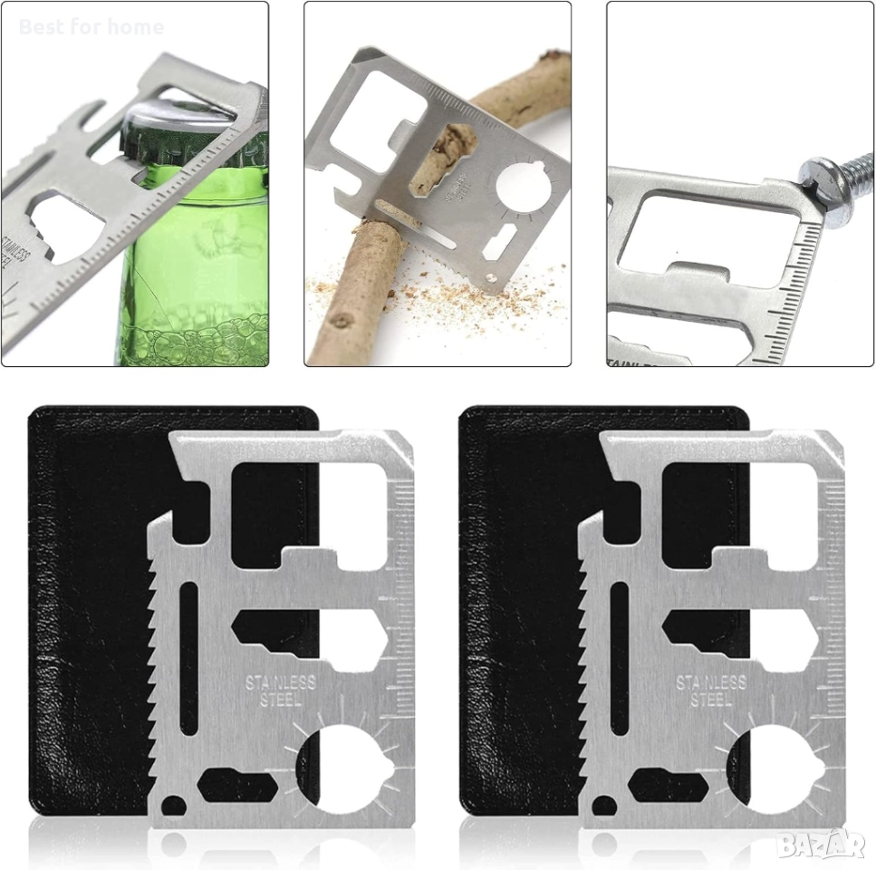 Компактен и лек: с размерите на кредитна карта е лесен за носене. Мултифункционалните карти могат лесно да се поставят в портфейл или джоб, много компактен и полезен, той е най-добрият инструмент за оцеляване с кредитни карти. Чудесен инструмент за изследователи, инструменти, туризъм, лов, риболов.