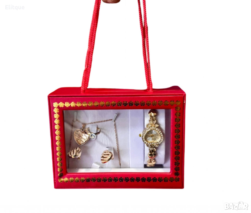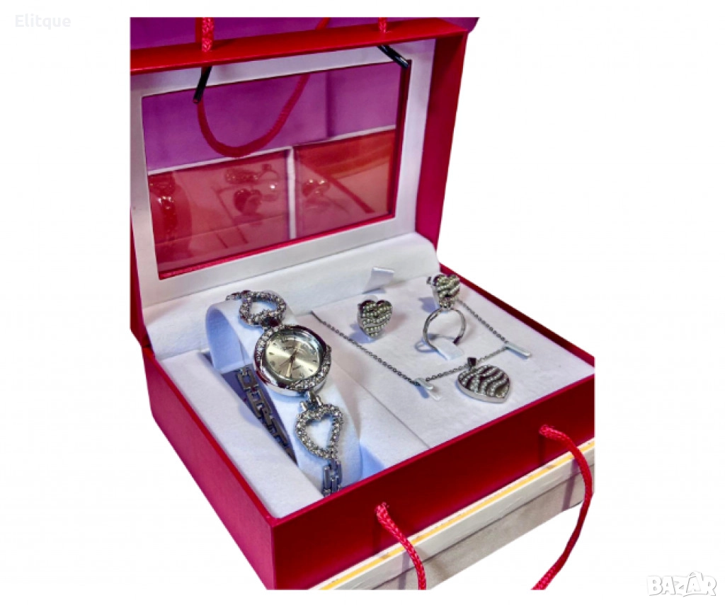 В този елегантен комплект ще откриете красиво изработен часовник, съчетан с прекрасно колие с форма на сърце, изтънчен пръстен и елегантни обеци с форма на сърце, които се допълват перфектно. Комплектът е наличен в два луксозни цвята – сребристо и златисто, изработен от висококачествена неръждаема стомана за дълготрайност и блясък. Всички елементи на комплекта се предлагат в луксозна подаръчна кутия. Перфектен избор за подарък за всяка специална дама в живота ви – за рождения ден, годишнина или просто без повод.