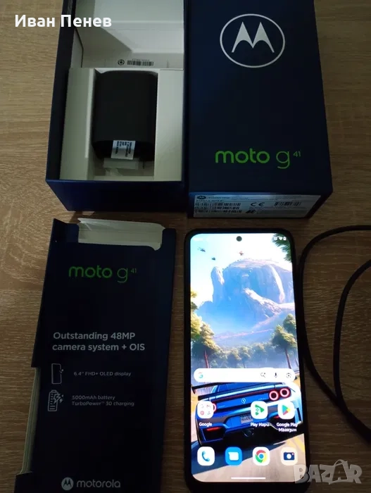 Телефончето е страхотно, има 6 RAM и 128GB хард диск както и батерия 5000mhl мили ампера, давам го и с бързо оригинално зарядно Motorola което зарежда 50% батерия за 30 минути, а целия се зарежда за час! Има и 48MP мегапиксела камера. Дори е водоустойчив. Давам го дори и с кейс, който е малко захъбен но все пак е кейс!