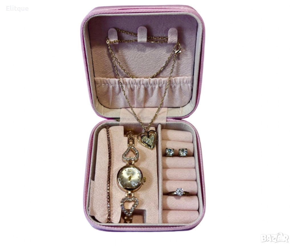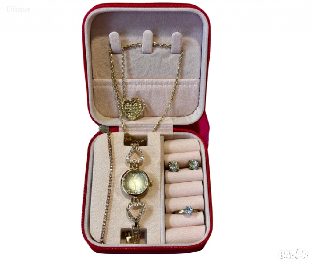 Този стилен комплект включва всичко необходимо, за да придаде завършеност на вашето ежедневие и специални моменти. В него ще откриете елегантен часовник с изискана визия, който е съчетан с прекрасно колие, елегантни обеци, шикозен пръстен и изтънчена гривна. Изработен с внимание към детайла и в два изтънчени цвята – сребристо и златисто, този комплект ще допълни всяка тоалет и ще подчертае вашата женственост и стил. Отличен избор за подарък за любимата жена, майка или приятелка – неустоим подарък за всеки повод! Комплекта пристига при Вас в елегантна кутия, затваряща се с цип и отделения за съхранение на бижутата.
