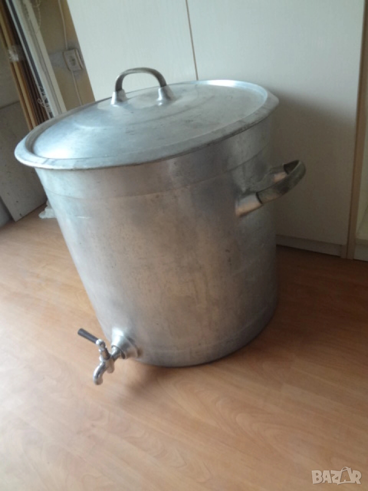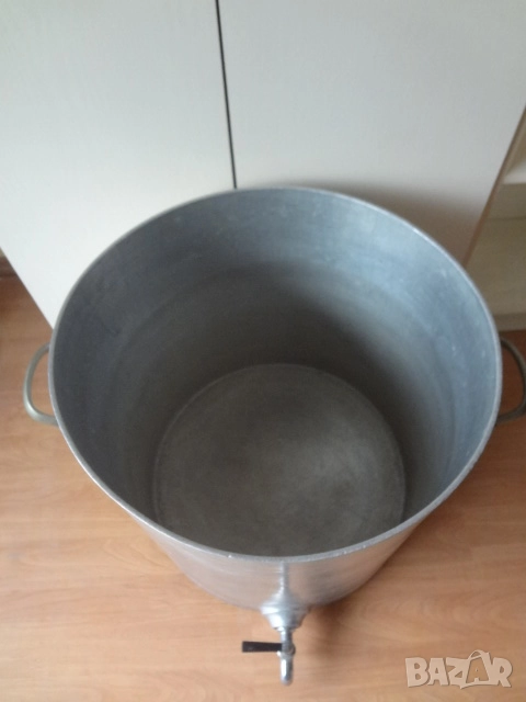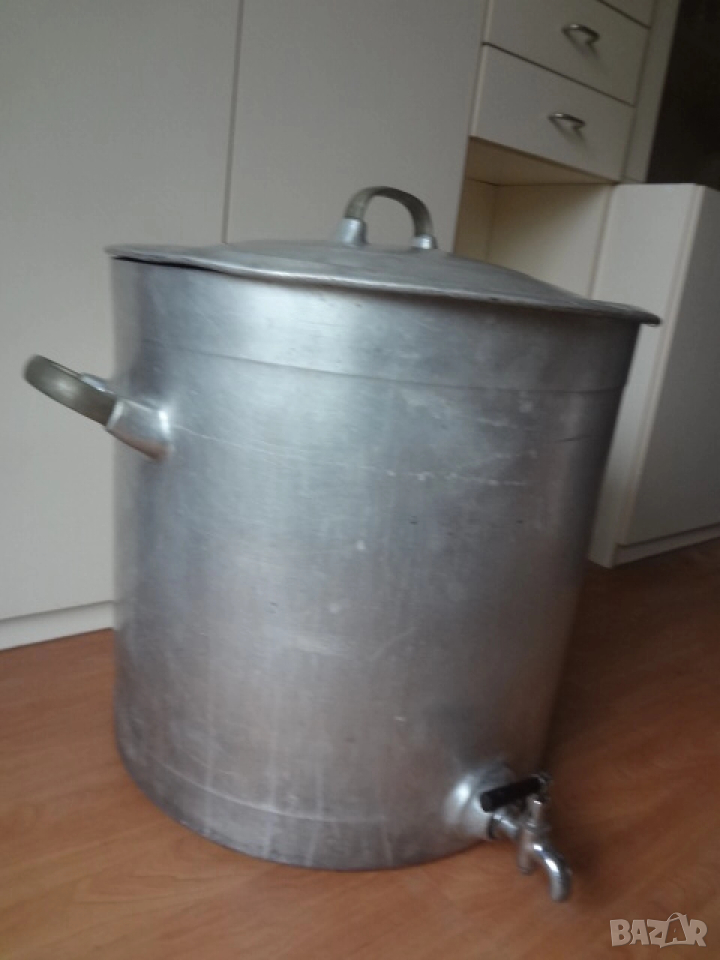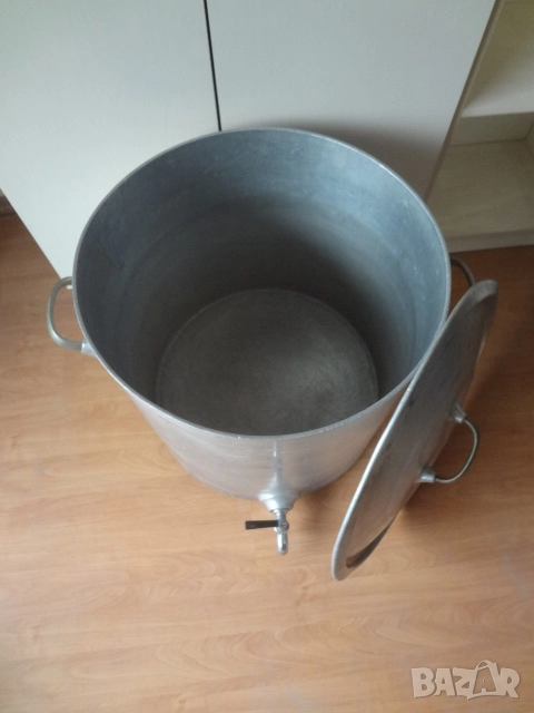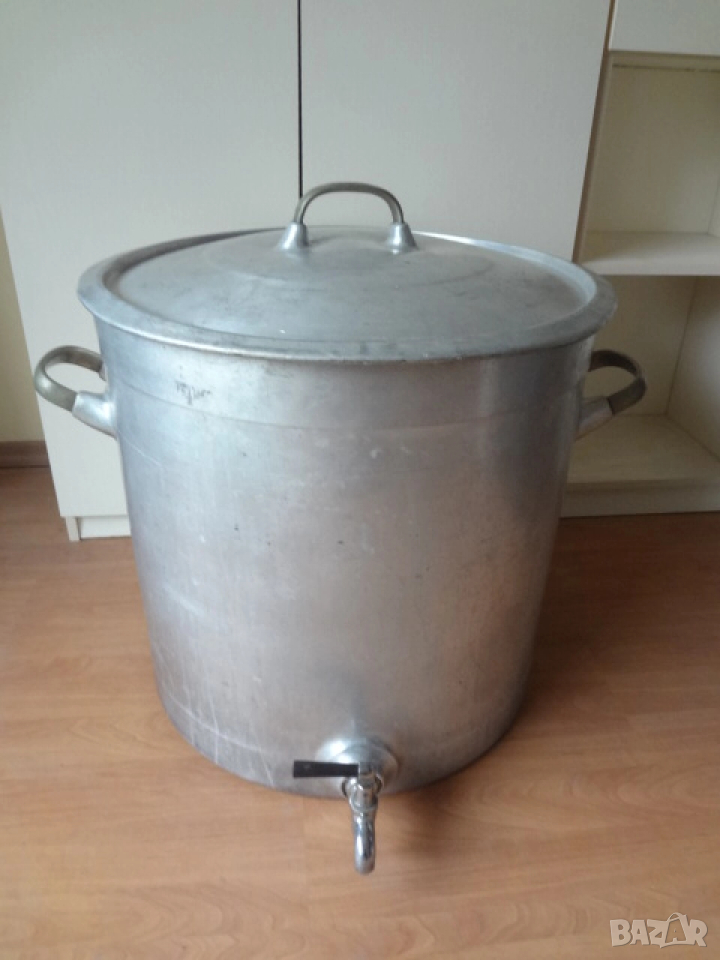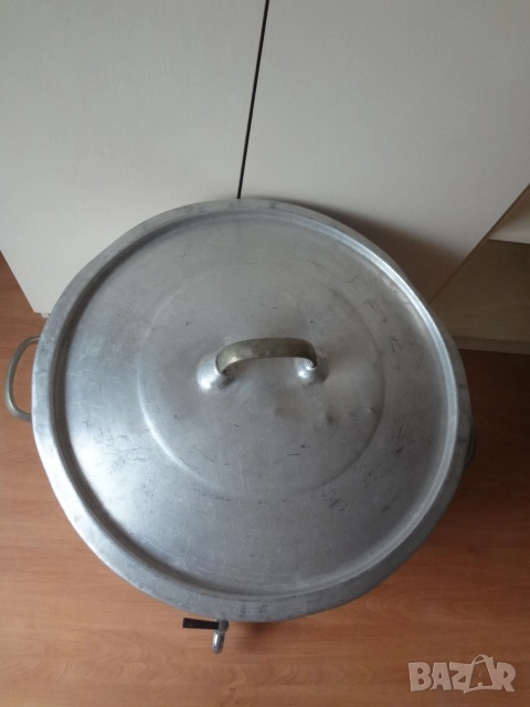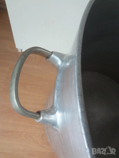 Много голям съд - казан ( бака , тенджера ) с капак. Изработен е от дебел 0,5 см. закален алуминий. Много здрав и масивен съд с две дръжки и хромирана канела на дъното. Може да се ползва за държане на мляко , вода , ракия и всякакви други течности. Става и като голяма тенджера за готвене на събитие за много хора. Намира се в отлично състояние и на практика е вечен. Събира 60 литра , а размерите са - диаметър 50 см.; височина - 50см.