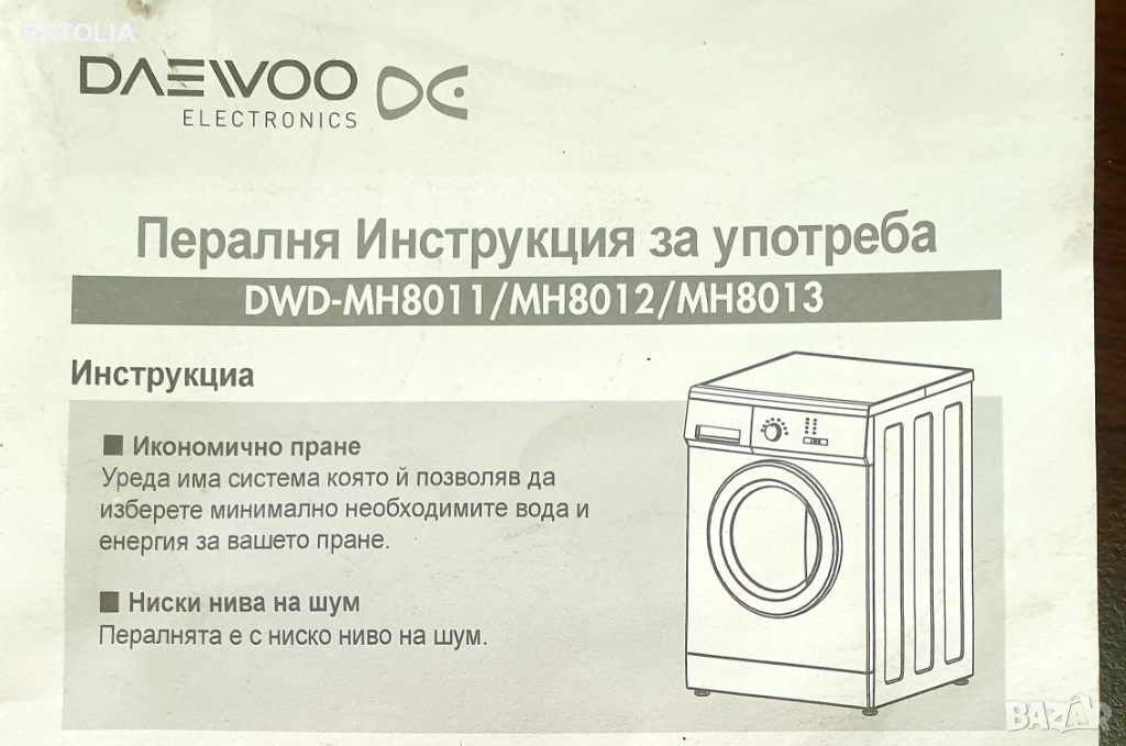 Продавам пералня DAEWOO. Книжка с инструкции и параметри, 800 оборота, 6-7 кг , A+, закупена от Техномаркет преди 2,5 г, но ползвана по малко от 1 . Запазена, работеща в перфектно състояние. Продава, се, поради смяна с по висок клас