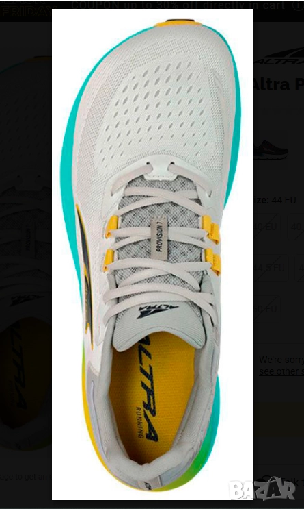 Altra се отличава с маратонки за бягане с технология Zero Drop. Това означава, че междинната подметка е с еднаква височина както при петата, така и при пръстите, осигурявайки естествено изживяване при бягане. Altra Provision 7 е подходяща само за бегачи от средната до предната част на стъпалото. Технологията FootPod е вградена, за да се съобрази с анатомичната позиция на стъпалото. Поради това обувката се препоръчва за бегачи с широко стъпало или hallux valgus.