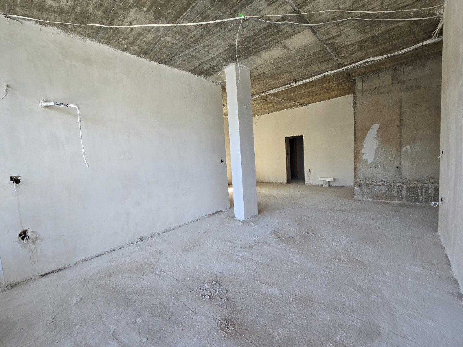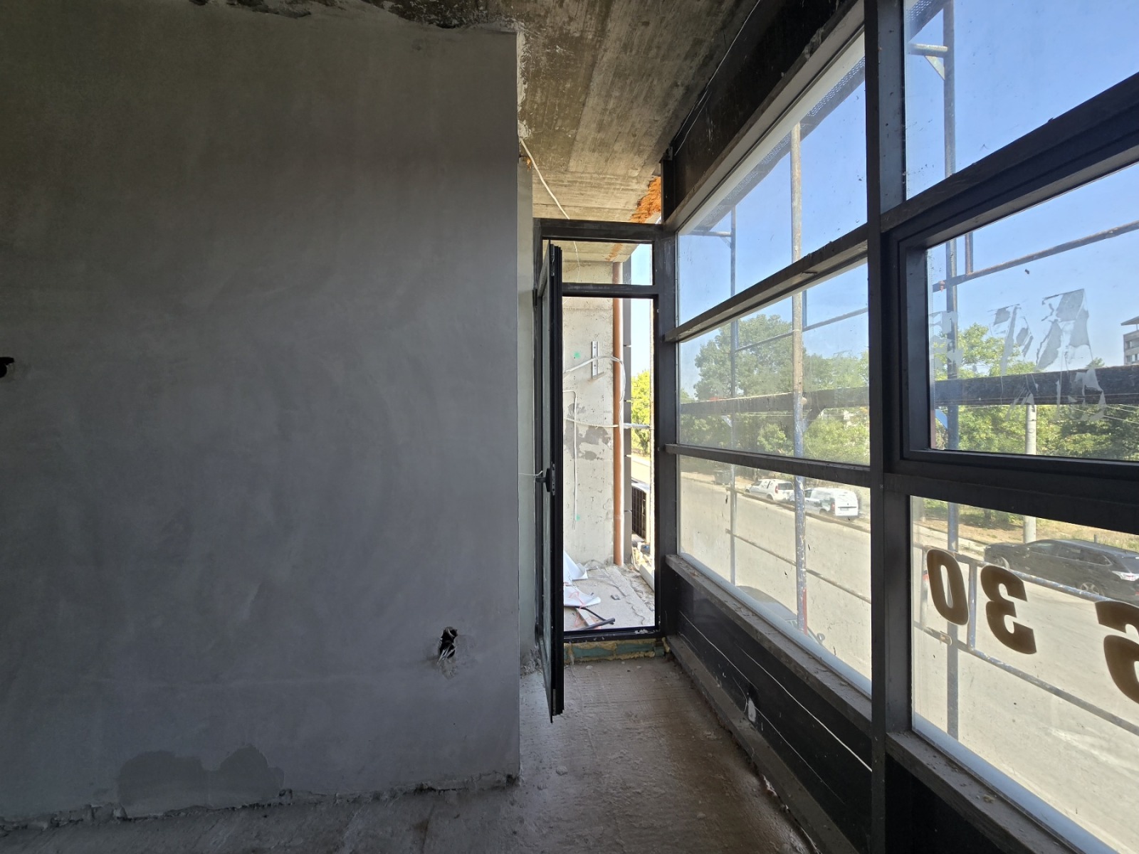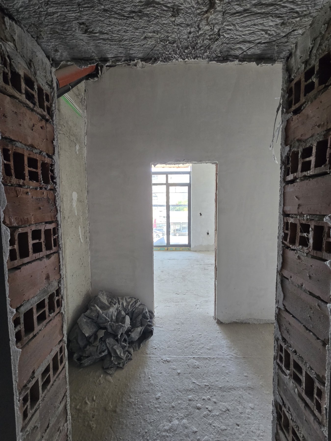 Оферта 77! Апартаментът се намира в нова сграда, пред АКТ 15, в процес на довършителни дейности, със срок за въвеждане в експлоатация - м. декември 2025г. Жилището е разположено на първи жилищен етаж, над търговски обект и се състои от антре, всекидневна с кухненски бокс, две спални, баня с тоалетна, перално помещение, килер и тераса. Застроената площ на обекта е 105,90кв.м., площ с общи части - 126,82кв.м. Изложение: изток - юг. Сградата се завършва с висок клас строителни материали и обектите ще бъдат издавани на шпакловка и замазка, с блиндирана входна врата, ВиК на тапа, ел. инсталация с обкичени ключове и контакти, видеодомофонна система. Възможност за закупуване на търговски обект - магазин, на две нива, разположен под апартамента и граничещ на етаж със складовото му помещение.