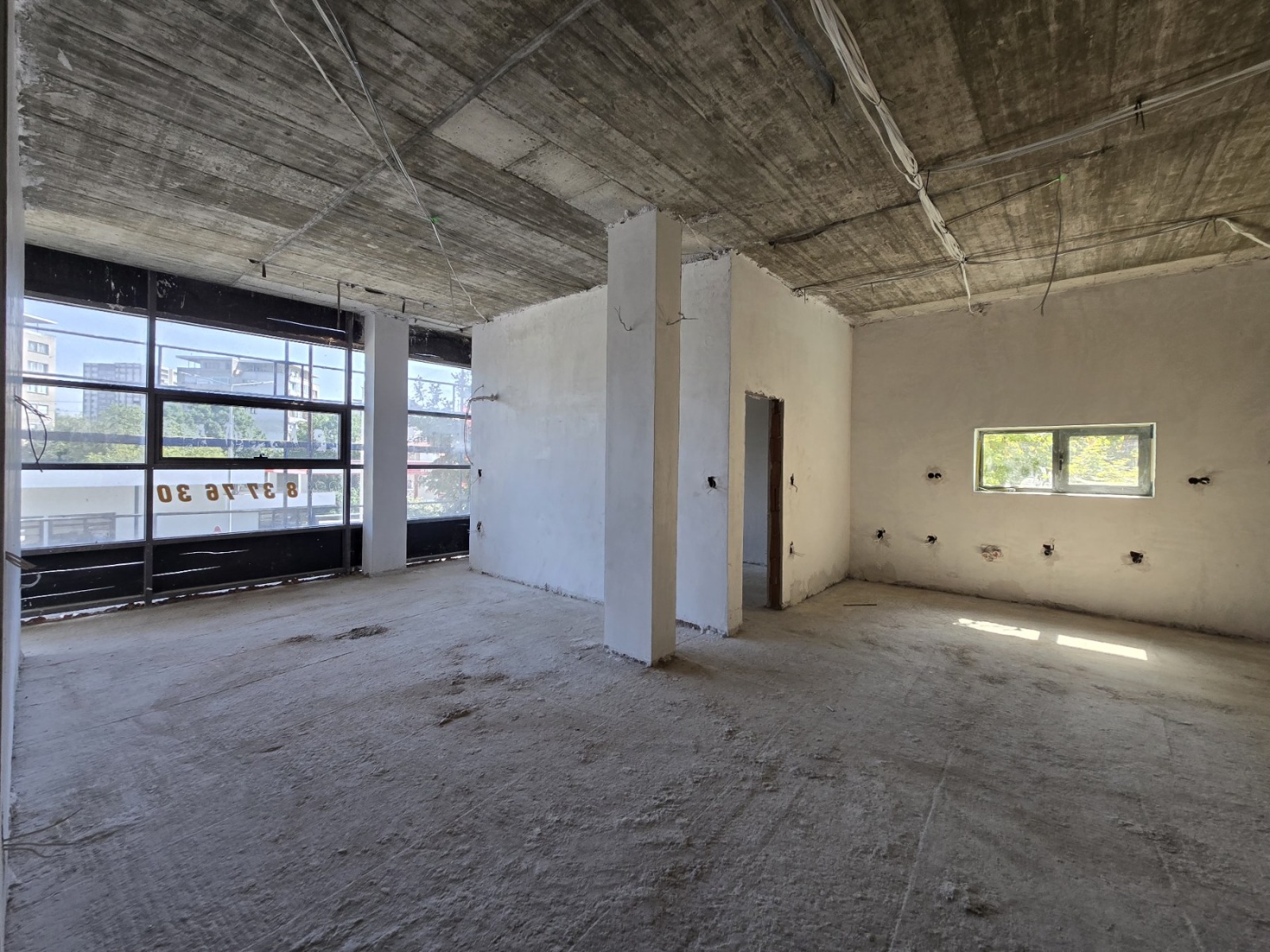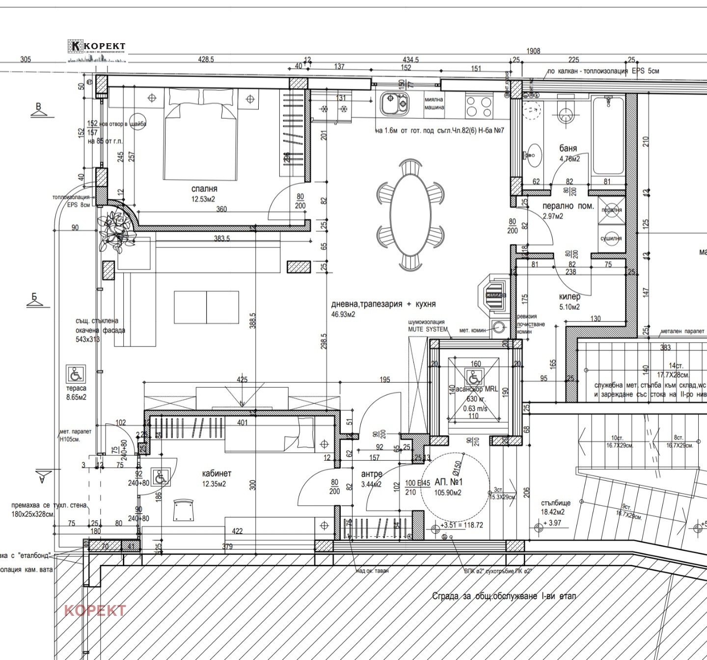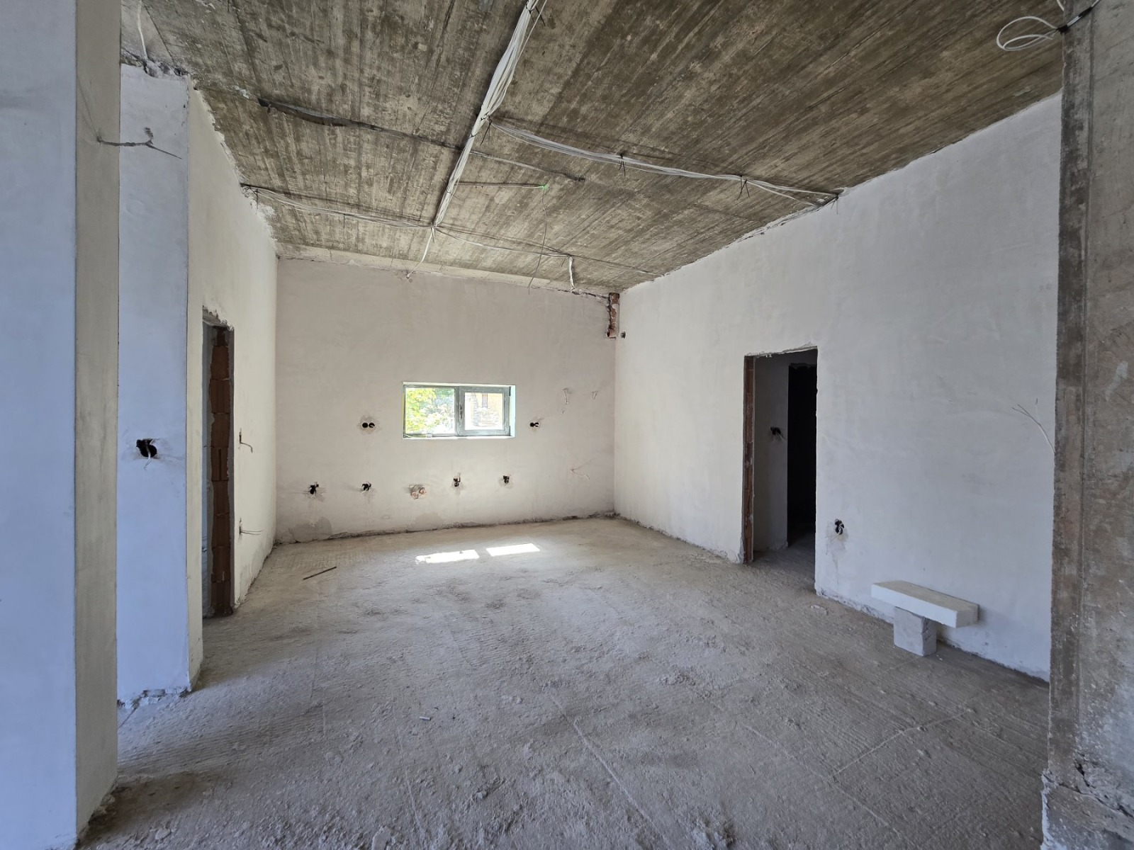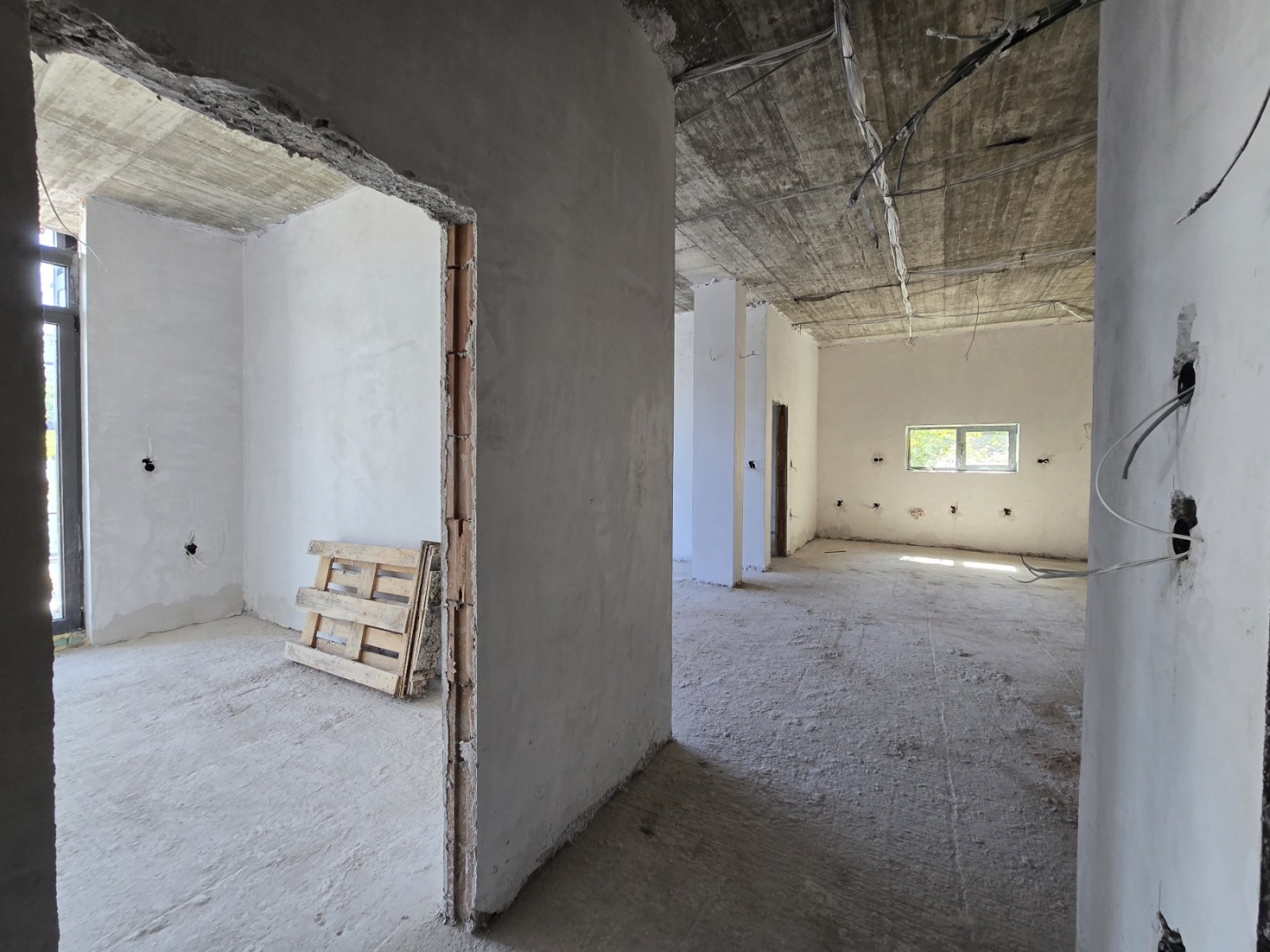 Оферта 77! Апартаментът се намира в нова сграда, пред АКТ 15, в процес на довършителни дейности, със срок за въвеждане в експлоатация - м. декември 2025г. Жилището е разположено на първи жилищен етаж, над търговски обект и се състои от антре, всекидневна с кухненски бокс, две спални, баня с тоалетна, перално помещение, килер и тераса. Застроената площ на обекта е 105,90кв.м., площ с общи части - 126,82кв.м. Изложение: изток - юг. Сградата се завършва с висок клас строителни материали и обектите ще бъдат издавани на шпакловка и замазка, с блиндирана входна врата, ВиК на тапа, ел. инсталация с обкичени ключове и контакти, видеодомофонна система. Възможност за закупуване на търговски обект - магазин, на две нива, разположен под апартамента и граничещ на етаж със складовото му помещение.