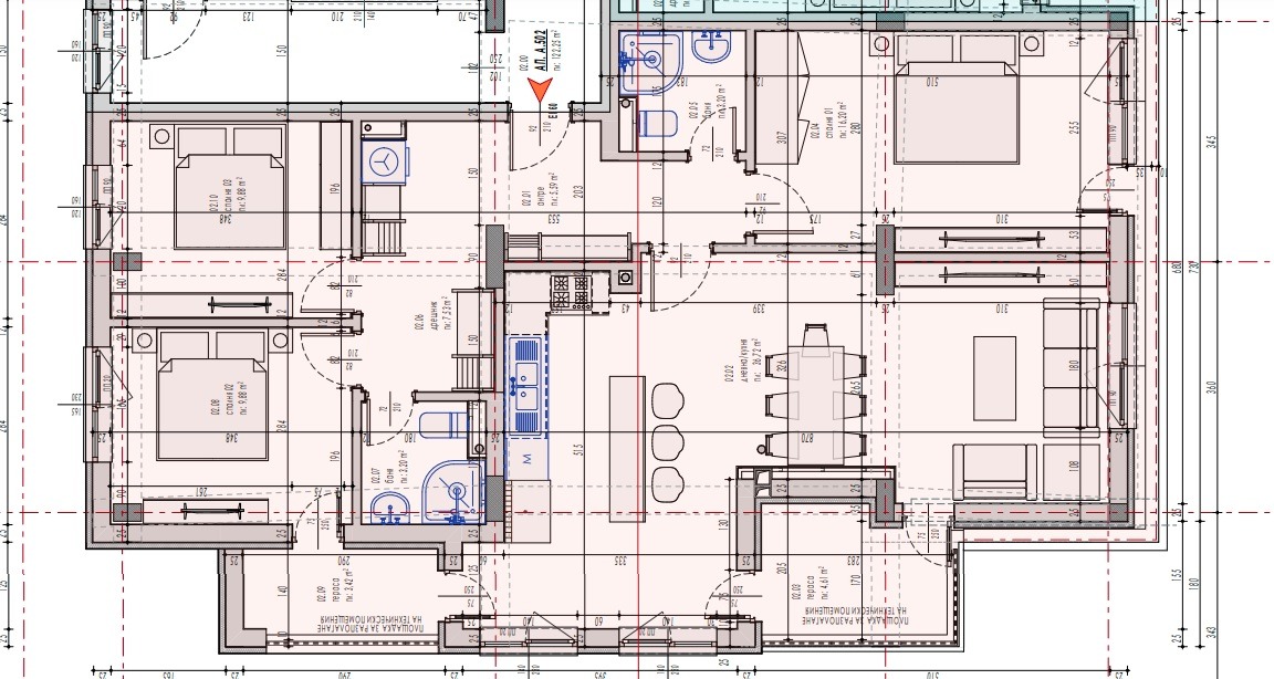 Апартаментът се намира в новострояща се сграда със смесено предназначение, находяща се на ул. Цар Самуил 93, на 400м. от площада на центъра и на 600м. от УМБАЛ Сърце и мозък, в бързо развиващ се район с изградена инфраструктура, учебни заведения, магазини и др. Състои се от антре, дневна с кухня и трапезария, три спални, две бани, дрешник, перално помещение, две тераси.