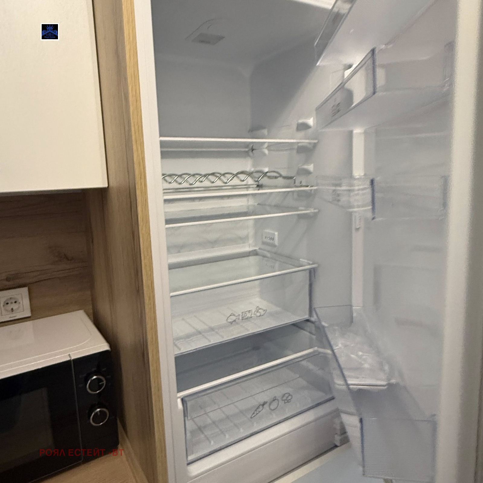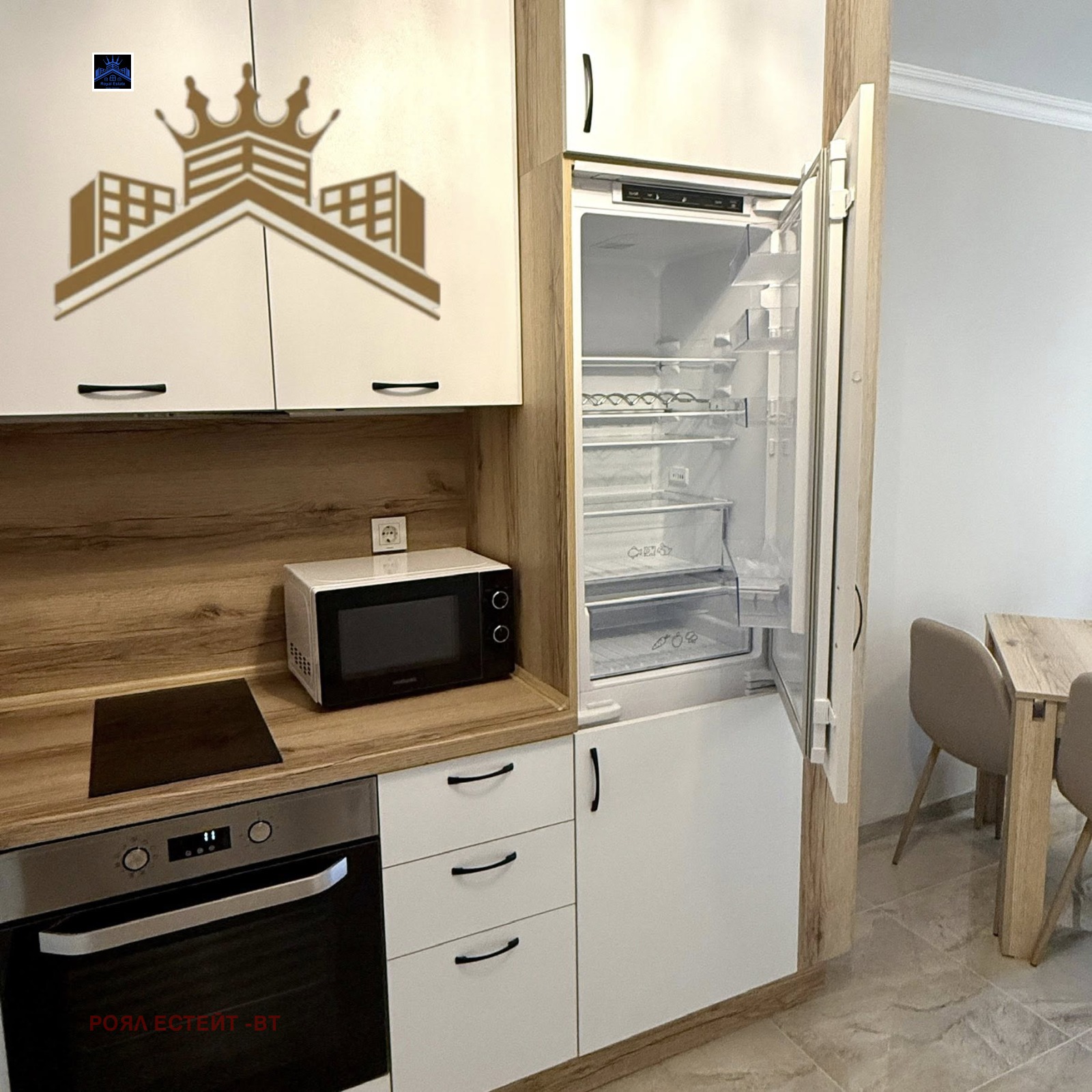Напълно оборудвана кухня, изработена по поръчка, с вграден хладилник с фризер, съдомиялна и всички необходими уреди -фурна ,керамични котлони, аспиратор, климатик,ТВ ,пералня и сушилня .Всичко е чисто ново .