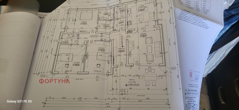 Агенция 'Фортуна' ексклузивно продава равен парцел с ПРОЕКТ ЗА КЪЩА, представляващ Едноетажна жилищна сграда с три спални, едната е с дрешник и санитарен възел, отделен санитарен възел, кухня с трапезария и голяма дневна с 20 кв.м. тераса. Застроената площ е 144 кв.м. Телефон за връзка 0897355392;