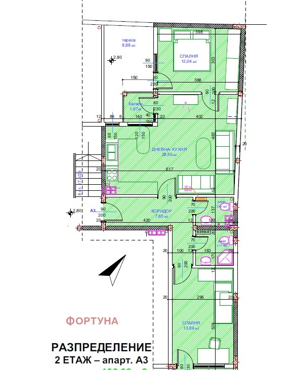 Агенция 'Фортуна' продава апартамент в новострояща се сграда в идеалния център на града, в близост до ул. Александровска, на пешеходно разстояние от всички топ локации, като Съдебната палата, Община Русе, Доходното здание... Сградата е в напреднал стадий на строеж, като се очаква Акт 16 около Нова година. Посочената квадратура е с общите части. Възможност за закупуване на Гараж 20 кв.м.- 35000 Евро; Телефон за връзка - 0897355392;