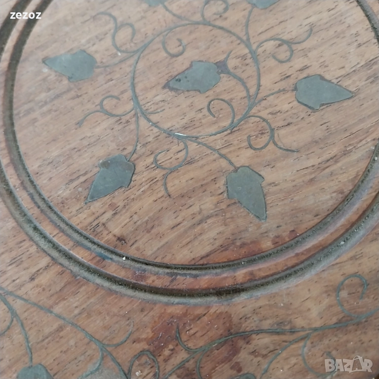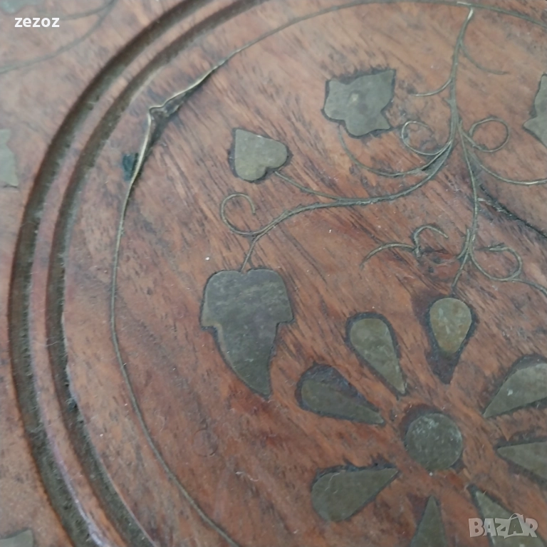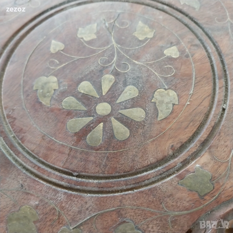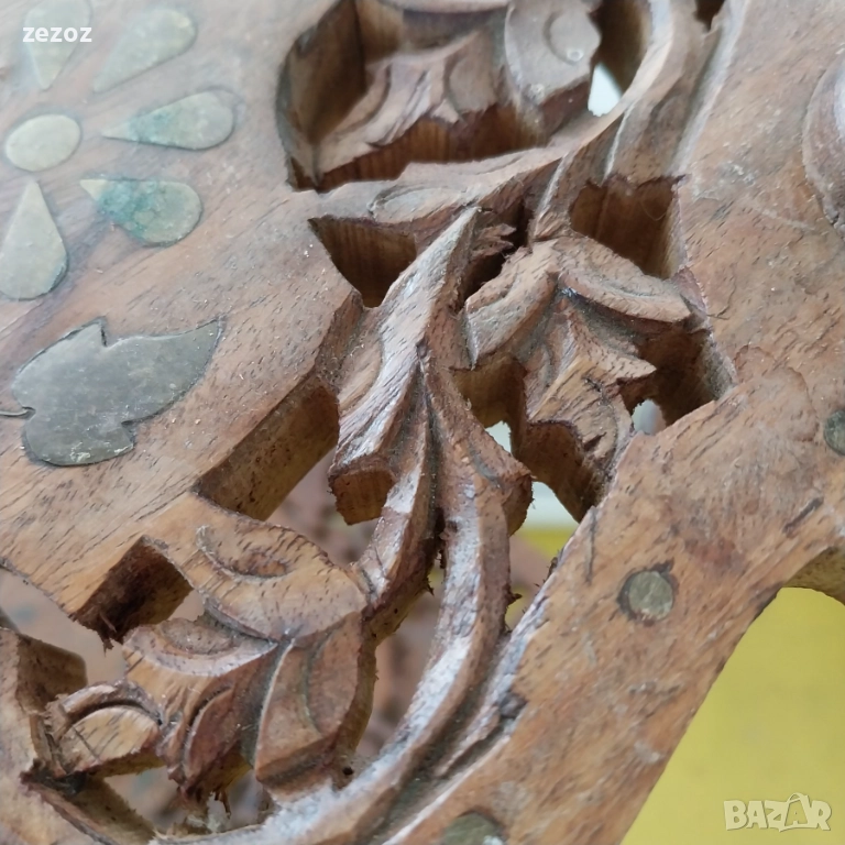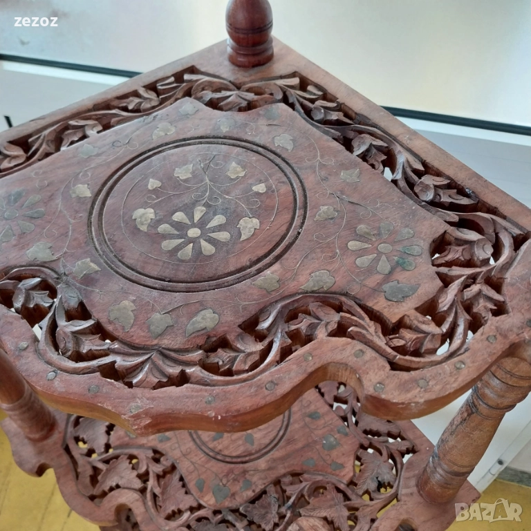 Ретро ъглова етажерка с четири рафта.Масив-мангово дърво.Най-вероятно е индийска.Четири изящно дърворезбовани рафта с месингова инкрустация.На едно от рафчетата има лека забележка по месинга,видимо на снимките.Размери-