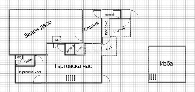 Сграда със смесено предназначение с обща площ от 253 кв. м., построена в парцел от 412 кв.м. кв. Болницата! Състои се от: търговско помещение с площ 150 кв. м., разпределено на: търговска част, складова част, санитарен възел и избено помещение /30кв.м./. Подовата настилка е гранитогрес. Второ търговско помещение с площ 52 кв.м., разпределено на: търговска част, склад и санитарно помещение. Подовата настилка е гранитогрес и теракота. Разполага и с жилищна част от 64 кв. м., разпределена на: входно антре, ДВЕ спални, кухня, баня и тоалетна и ДВОР /149кв. м./ Подовата настилка е ламиниран паркет и теракота. Сградата е газифицирана. Има различни варианти за продажба на търговската и жилищната част. Всяко от търговските помещения може да бъде закупено с жилищната част със задния двор. Жилищната част не се продава самостоятелно.