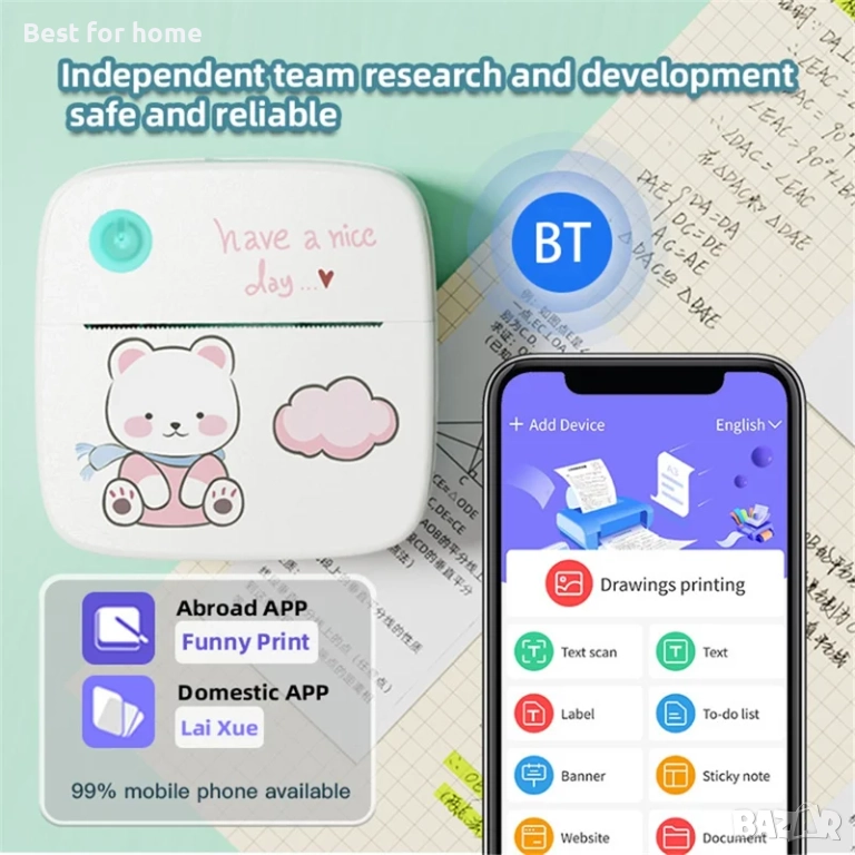 Може да се използва за отпечатване на QR кодове, албуми, дневници, етикети за съхранение, списъци, бележки, снимки и др.