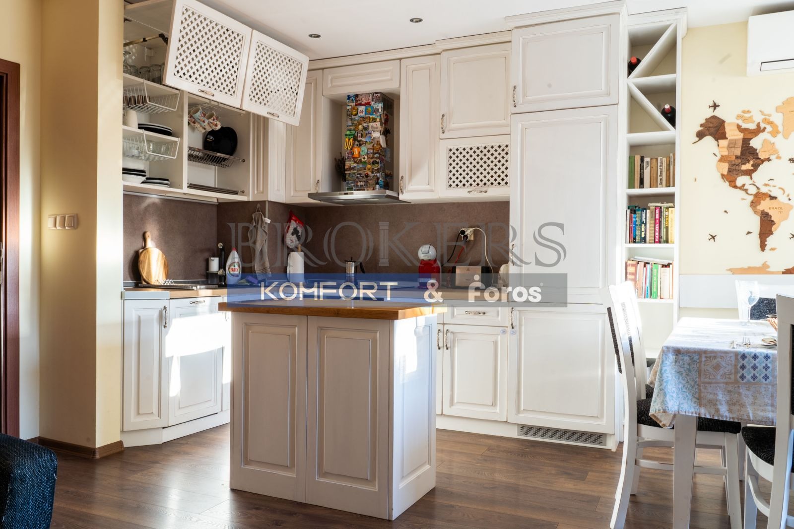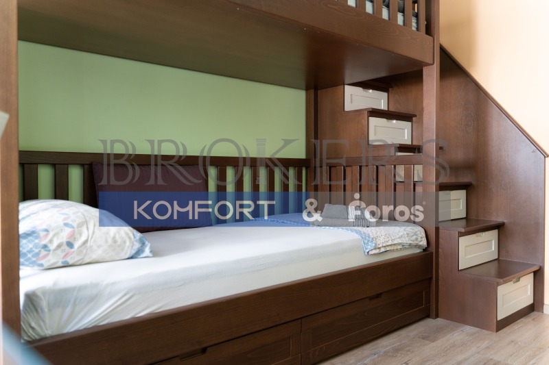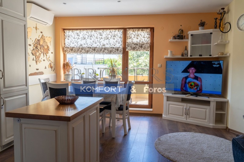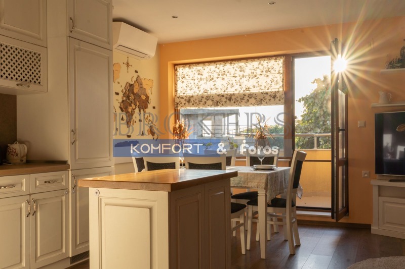 Кухнята е изработена от масивно дърво и е оборудвана с електроуреди клас А++, климатици Дайкин, включително: хладилник, фурна, керамичен плот, аспиратор и съдомиялна. Обзавеждането е запазено, функционално и поддържано.