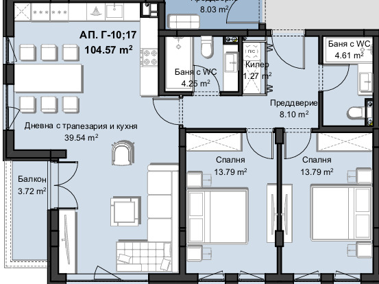 🟡Разпределение: Всекидневна + кухненски бокс, родителска спалня, детска спалня, 2баня+тоалетна, тераса, склад, разположени на чиста площ от 104,57кв.м. и обща площ от 127,94кв.м.;