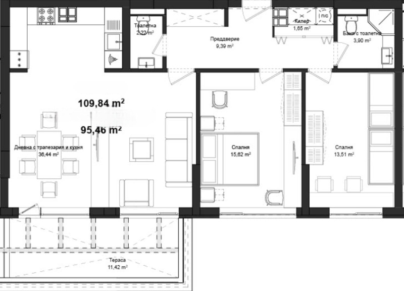🟡 Разпределение: Всекидневна + кухненски бокс, родителска спалня, детска спалня, баня+тоалетна, тоалетна, килер, тераса, разположени на чиста площ от 109,84кв.м.