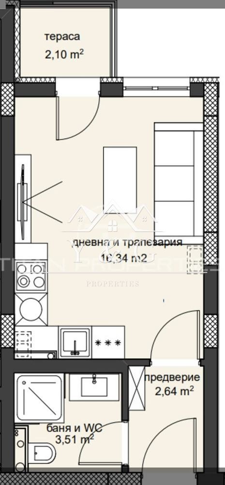 🟡Разпределение: Всекидневна + кухненски бокс, баня+тоалетна, тераса;