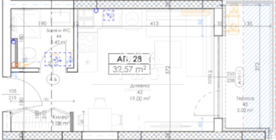 🟡 Разпределение: Всекидневна + кухненски бокс, баня+тоалетна, тераса, килер разположени на чиста площ от 32,57кв.м. и обща площ от 37,10кв.м,